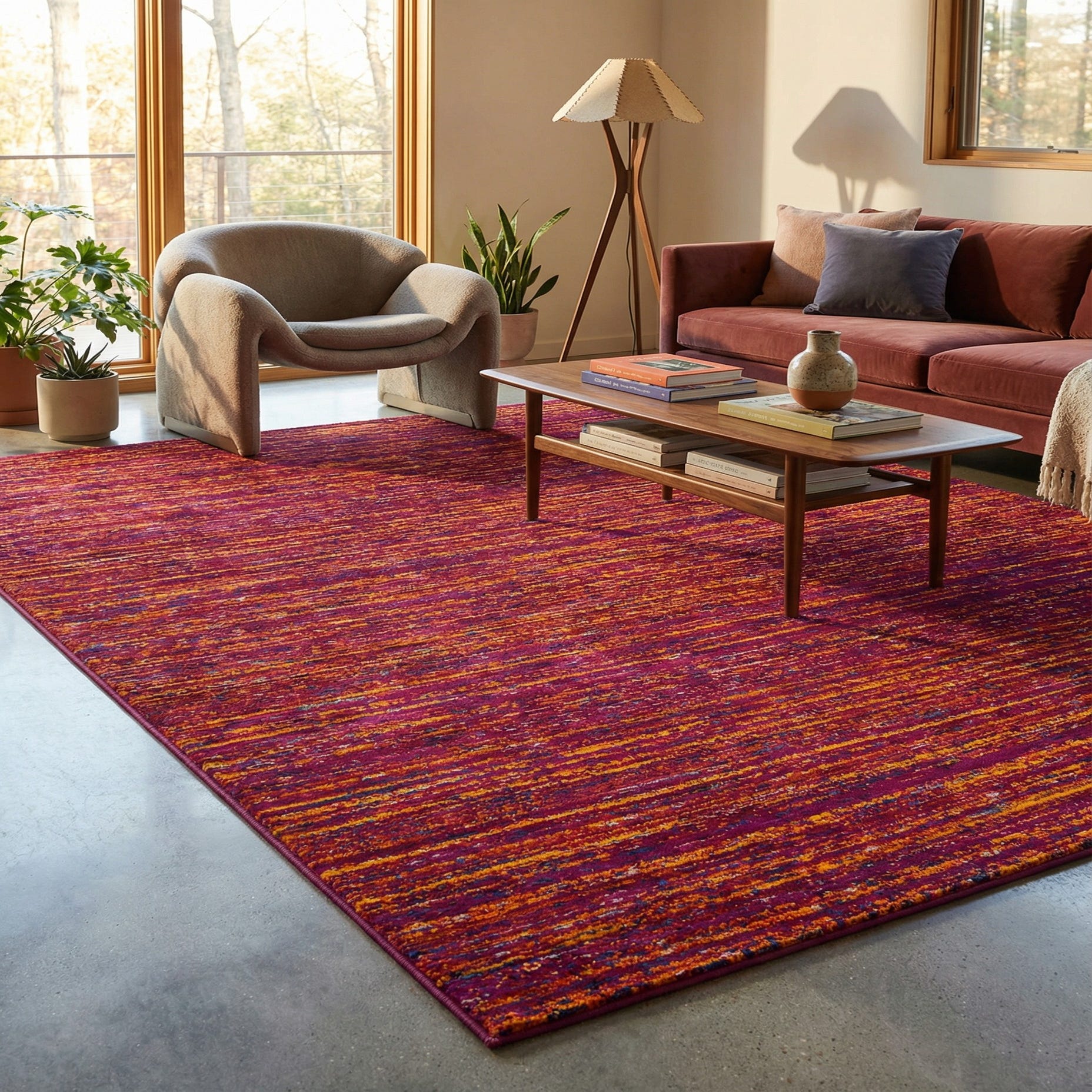 Primary color is Pink. Colors in this rug include: Pink, Navy Blue, Yellow, Orange, Red.