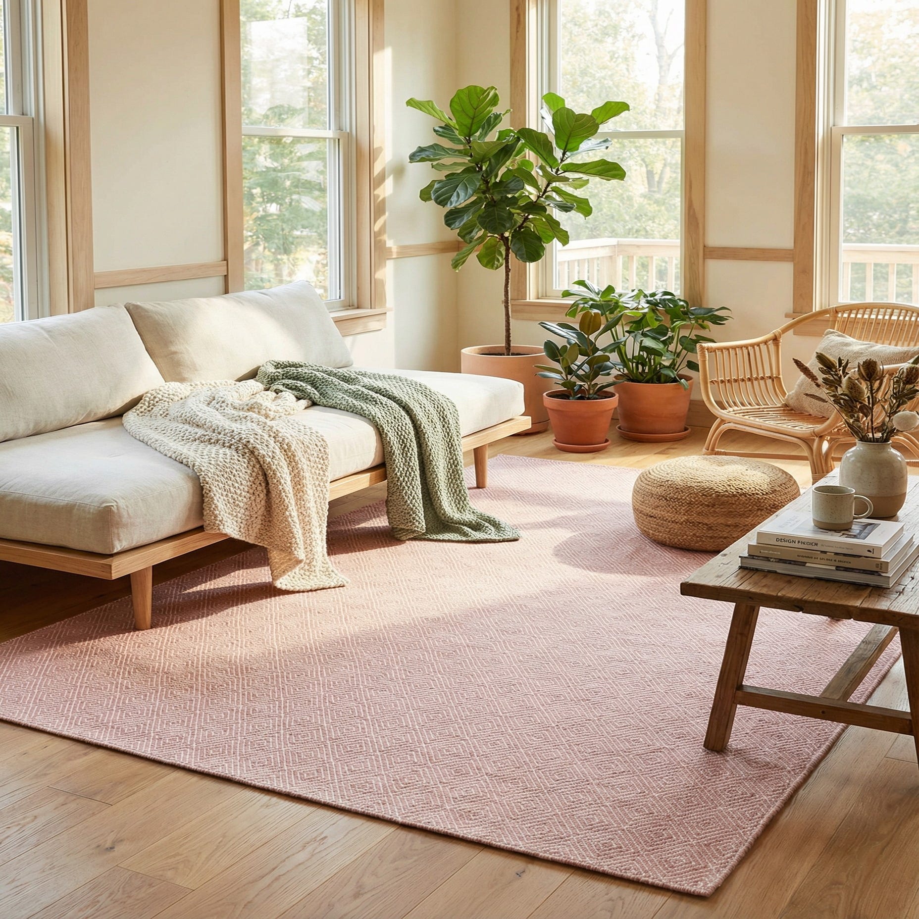 Primary color is Pink. Colors in this rug include: Pink, Ivory.