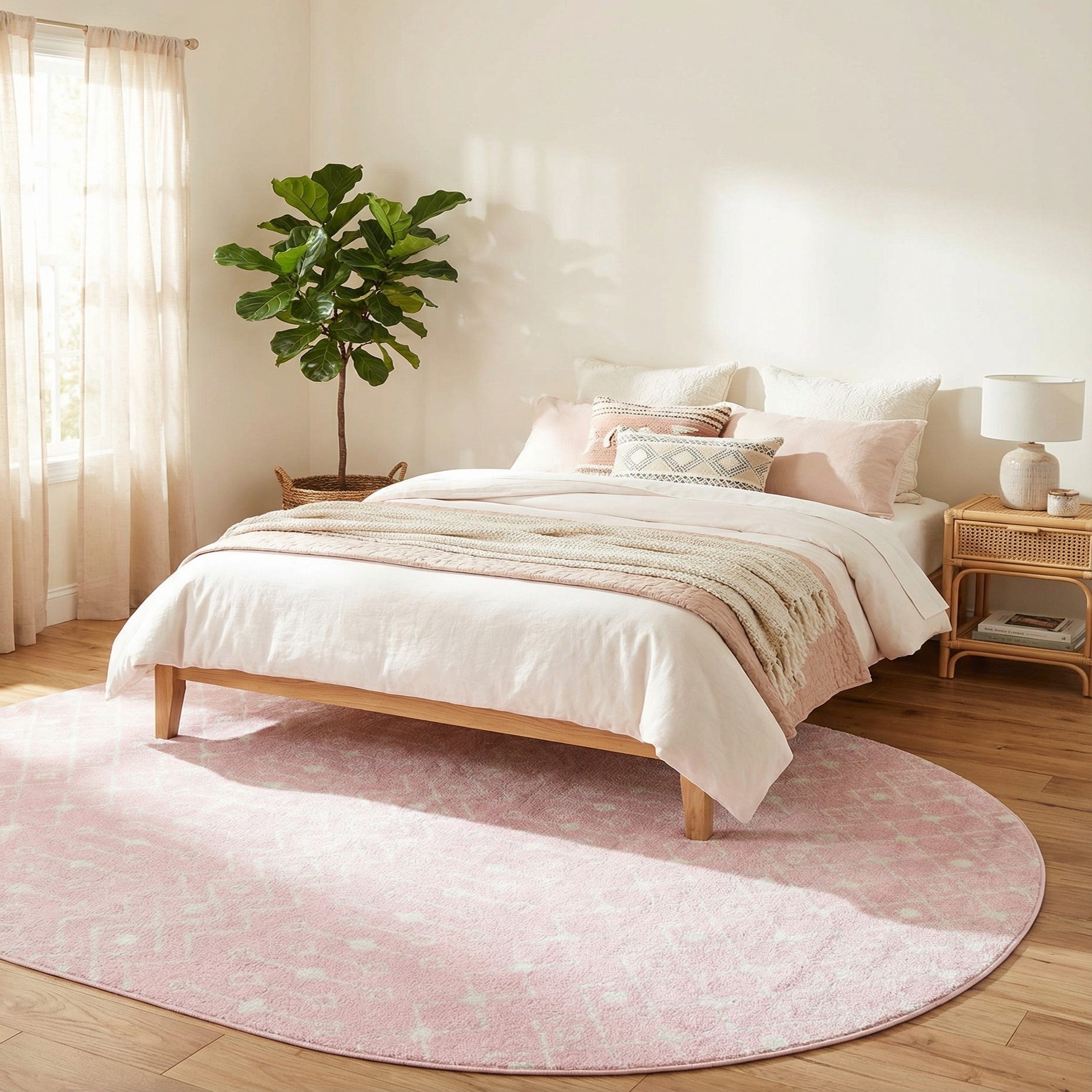 Primary color is Pink. Colors in this rug include: Pink, Ivory.