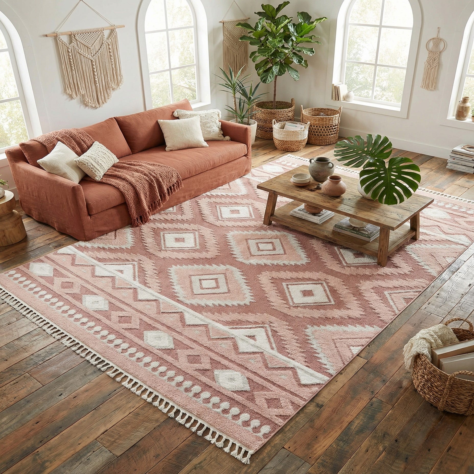 Primary color is Pink. Colors in this rug include: Pink, Ivory.