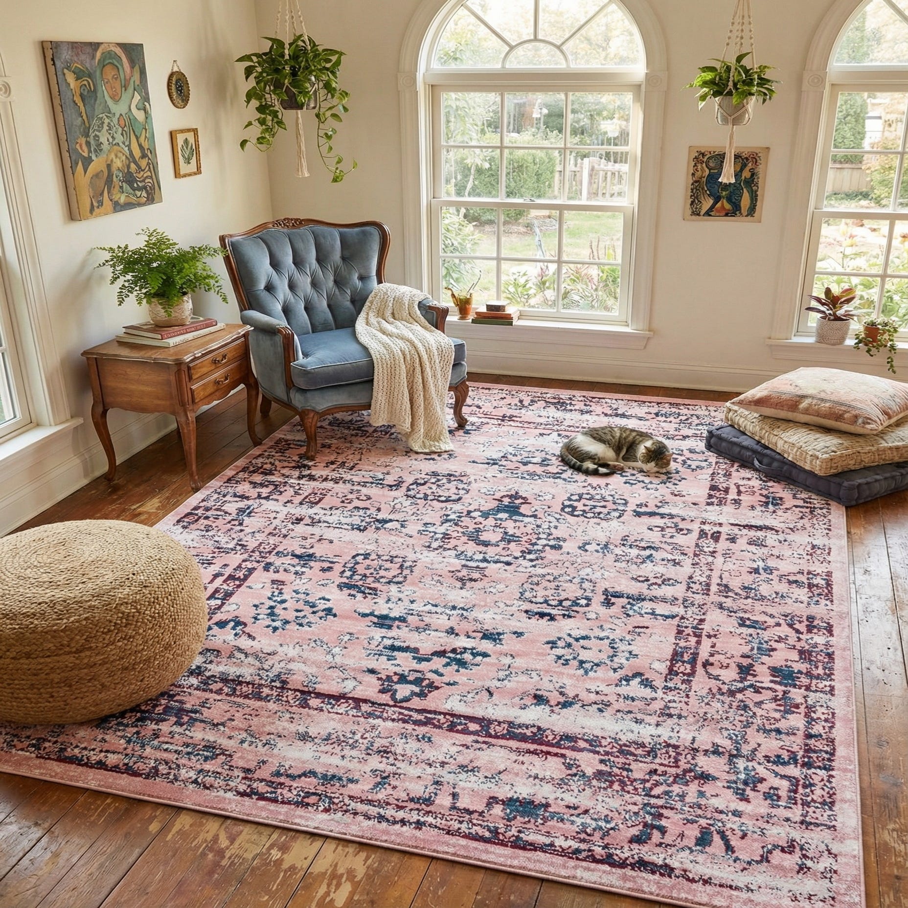 Primary color is Pink. Colors in this rug include: Pink, Burgundy, Ivory, Navy Blue.