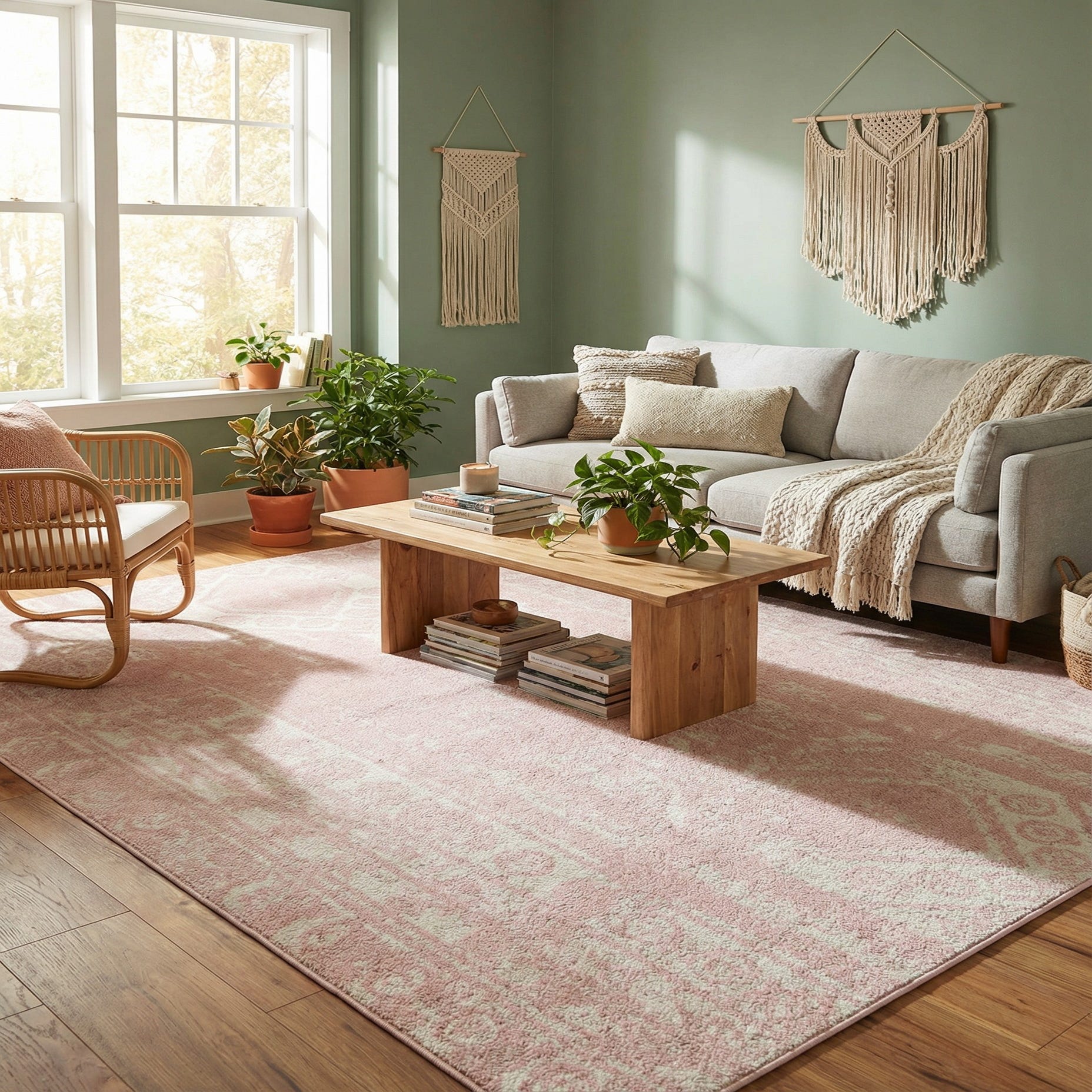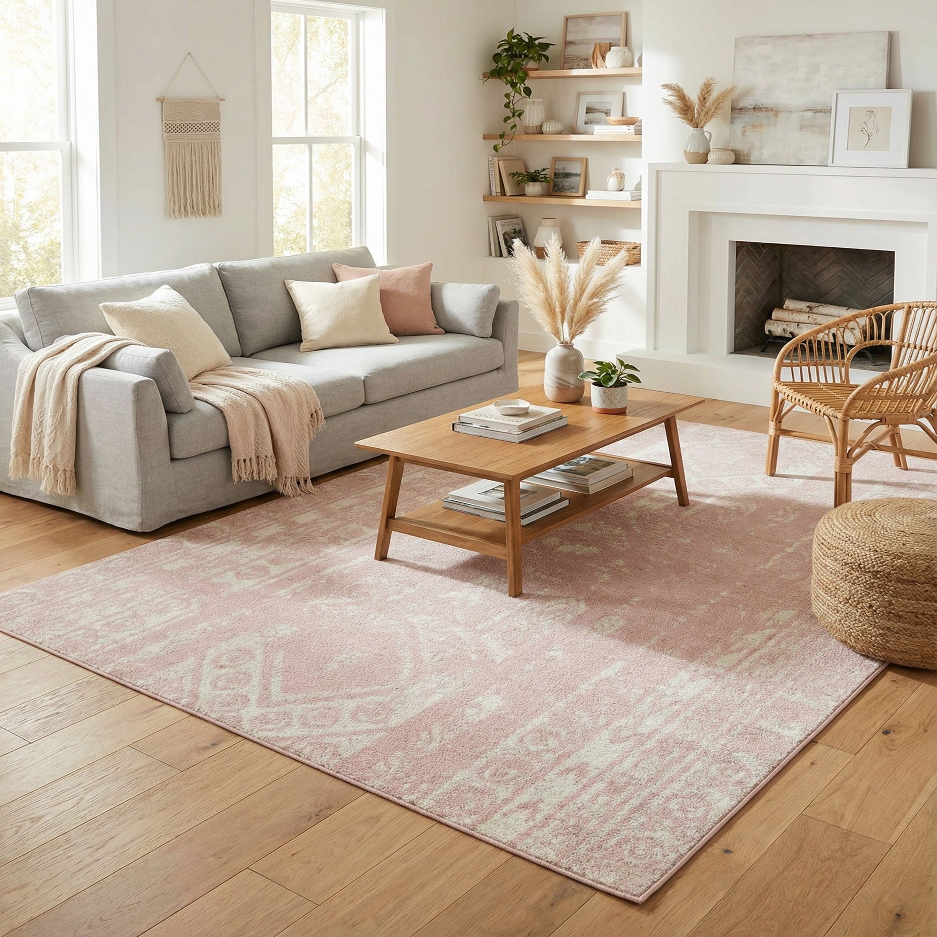 Primary color is Pink. Colors in this rug include: Pink, Ivory.