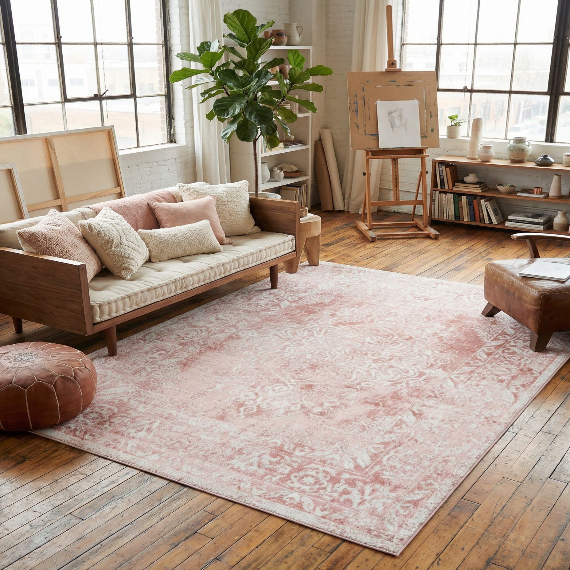 Primary color is Pink. Colors in this rug include: Pink, Ivory.