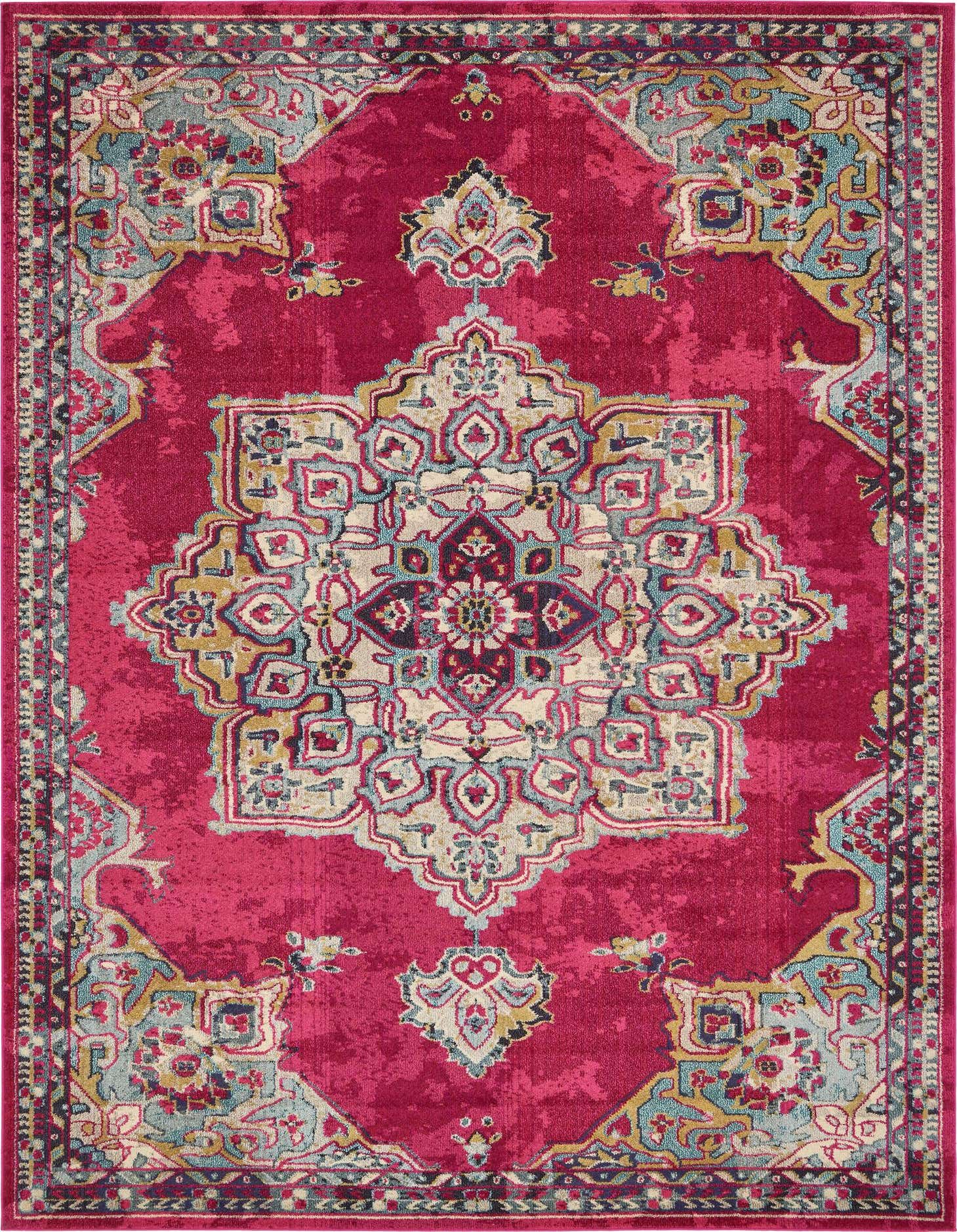 Primary color is Pink. Colors in this rug include: Pink, Beige, Gold, Light Green, Navy Blue, Puce, Violet.