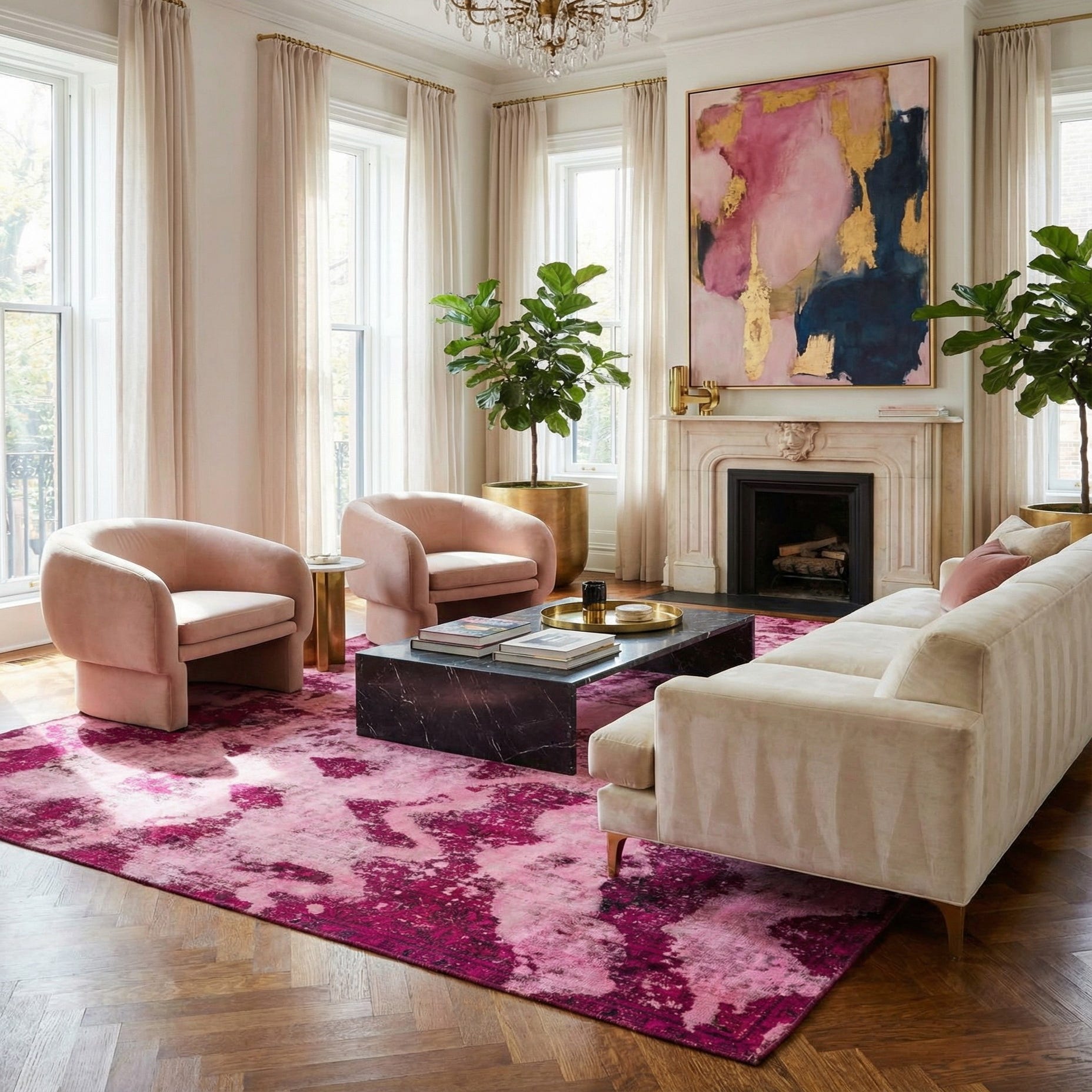 Primary color is Pink. Colors in this rug include: Pink, Burgundy, Red, Violet, Navy Blue, Beige.