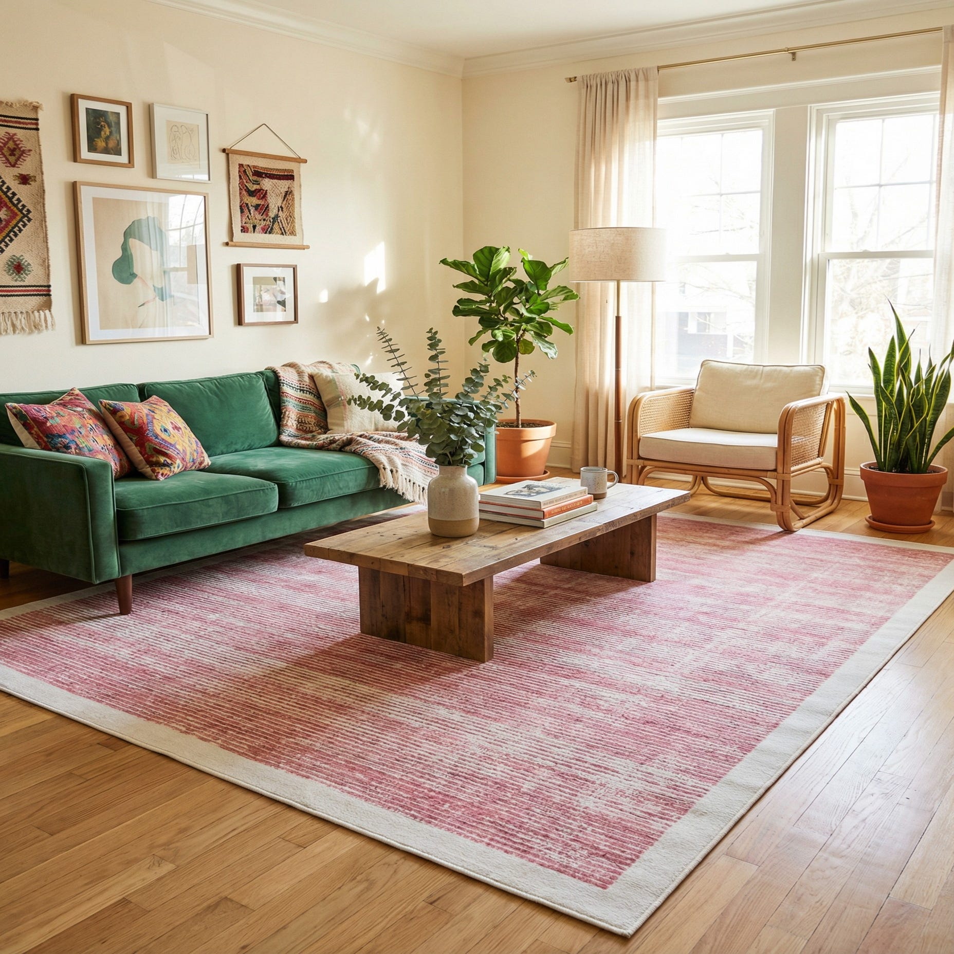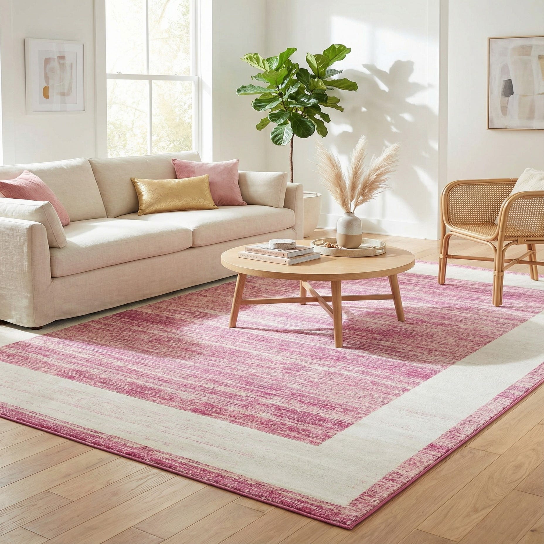 Primary color is Pink. Colors in this rug include: Pink, Ivory.