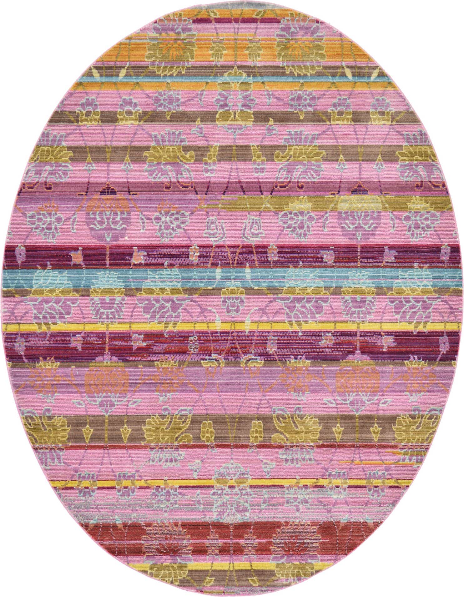 Primary color is Pink. Colors in this rug include: Pink, Beige, Blue, Orange, Red, Yellow.