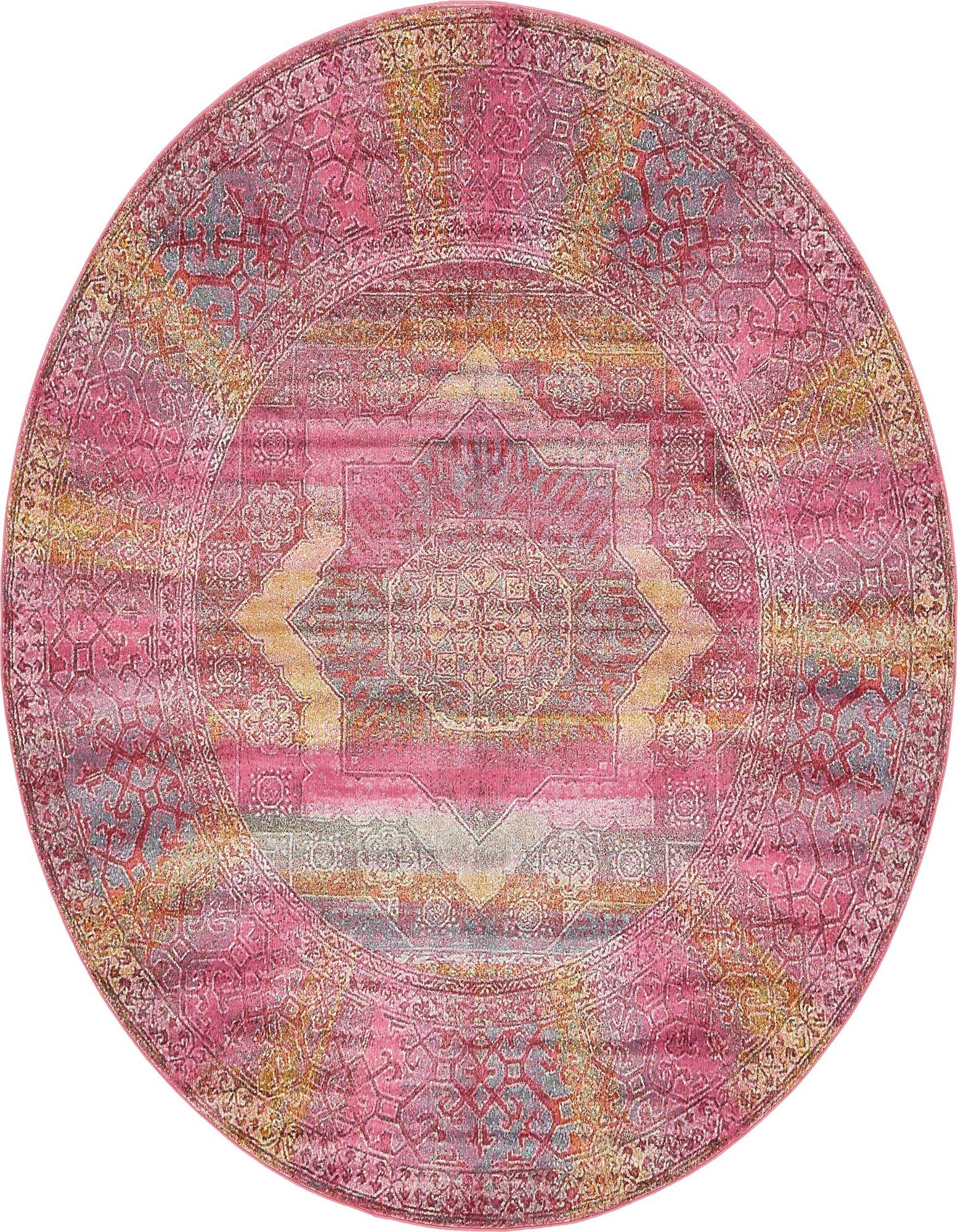 Primary color is Pink. Colors in this rug include: Pink, Green, Olive, Orange, Red, Ivory.