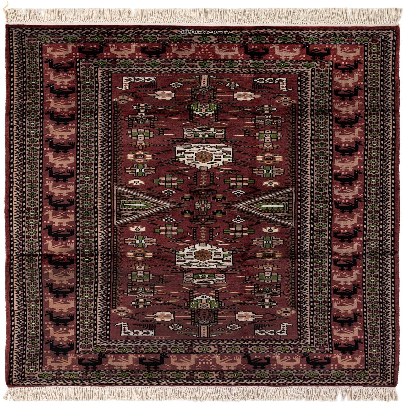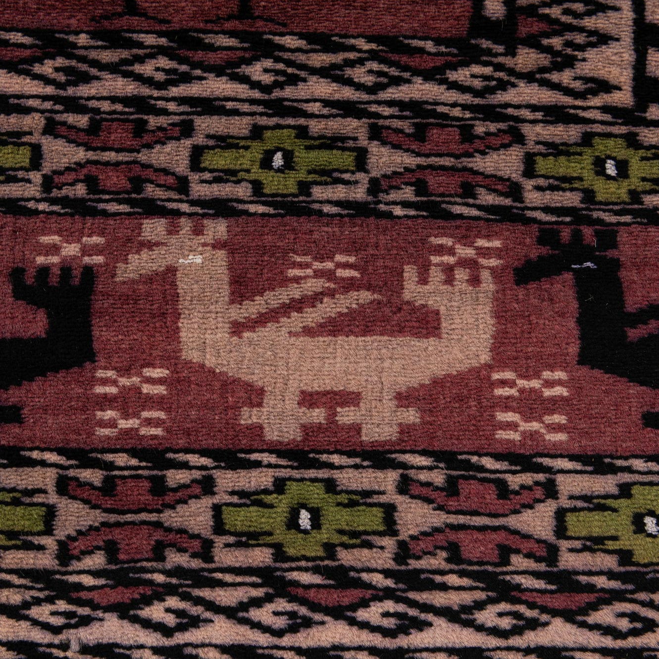 Primary color is Plum Red. Colors in this rug include: Plum Red, Black, Green, Ivory, Gold.