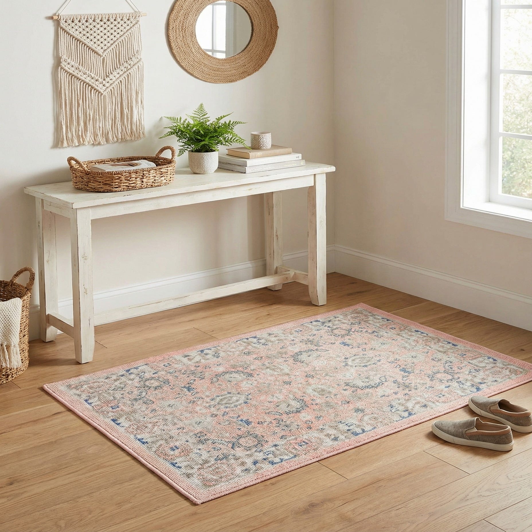 Primary color is Powder Pink. Colors in this rug include: Powder Pink, Blue, Gray, Ivory, Light Blue.