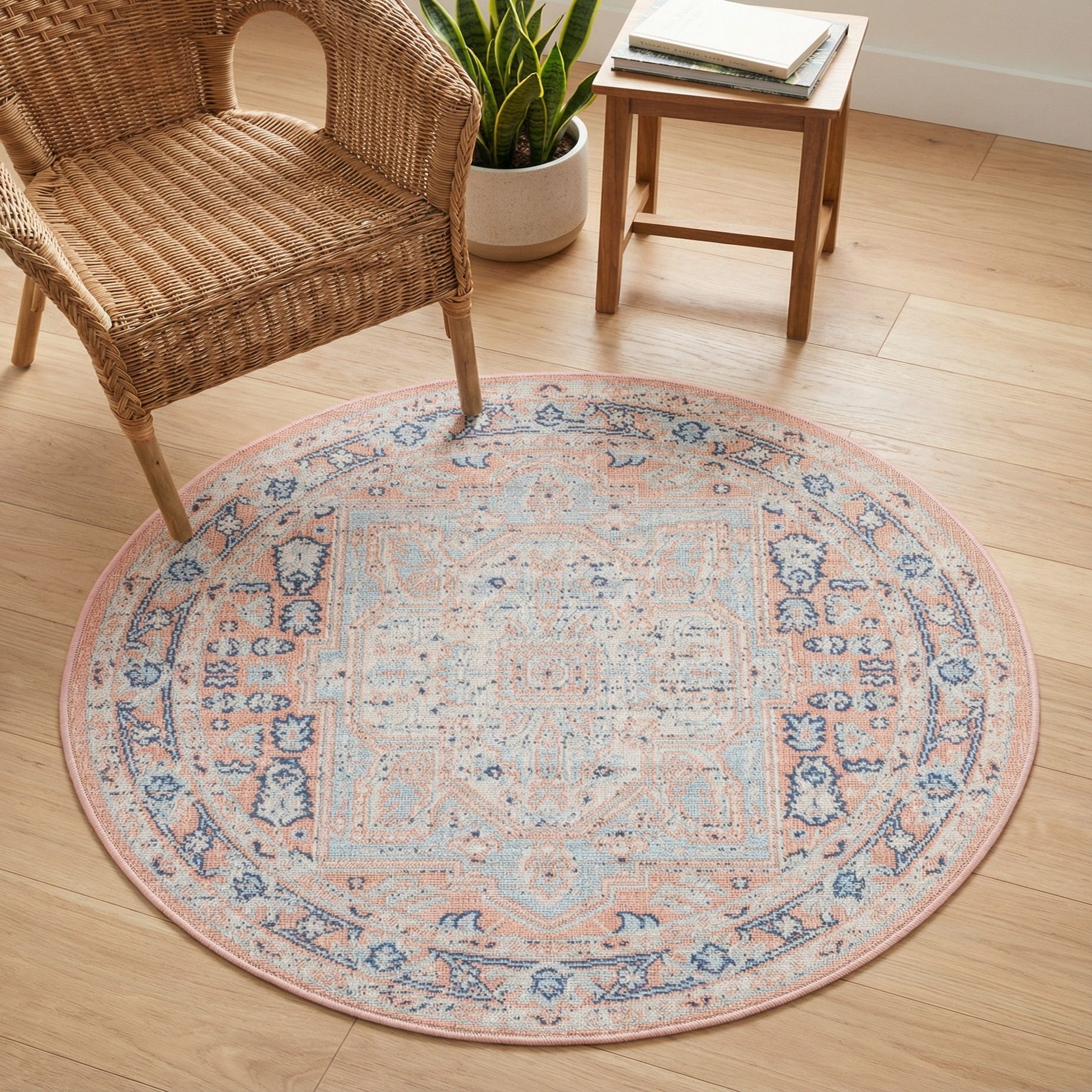 Primary color is Powder Pink. Colors in this rug include: Powder Pink, Blue, Light Blue, Ivory.