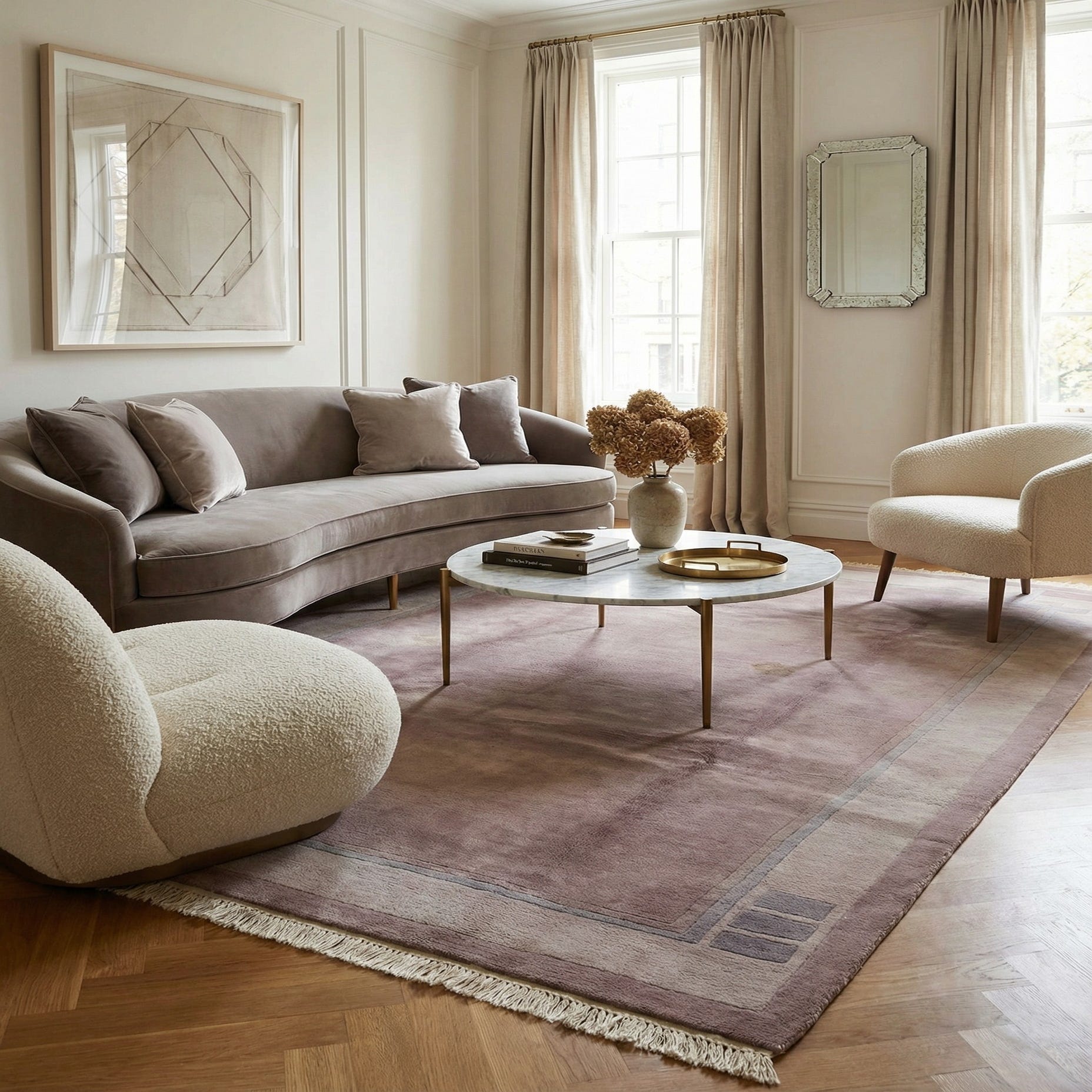 Primary color is Puce. Colors in this rug include: Puce, Purple, Beige.