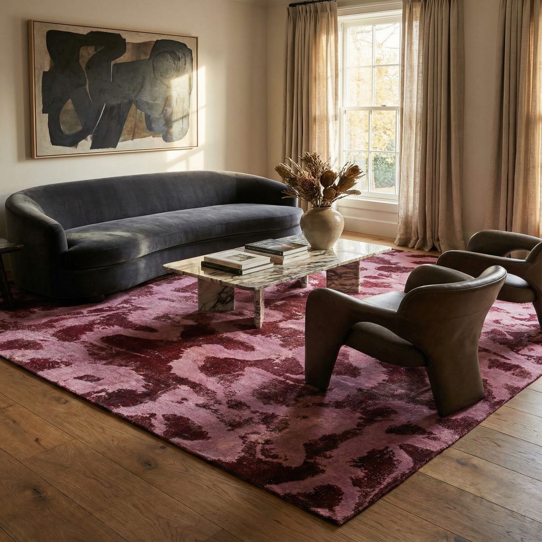 Primary color is Puce. Colors in this rug include: Puce, Black, Burgundy, Red, Pink.