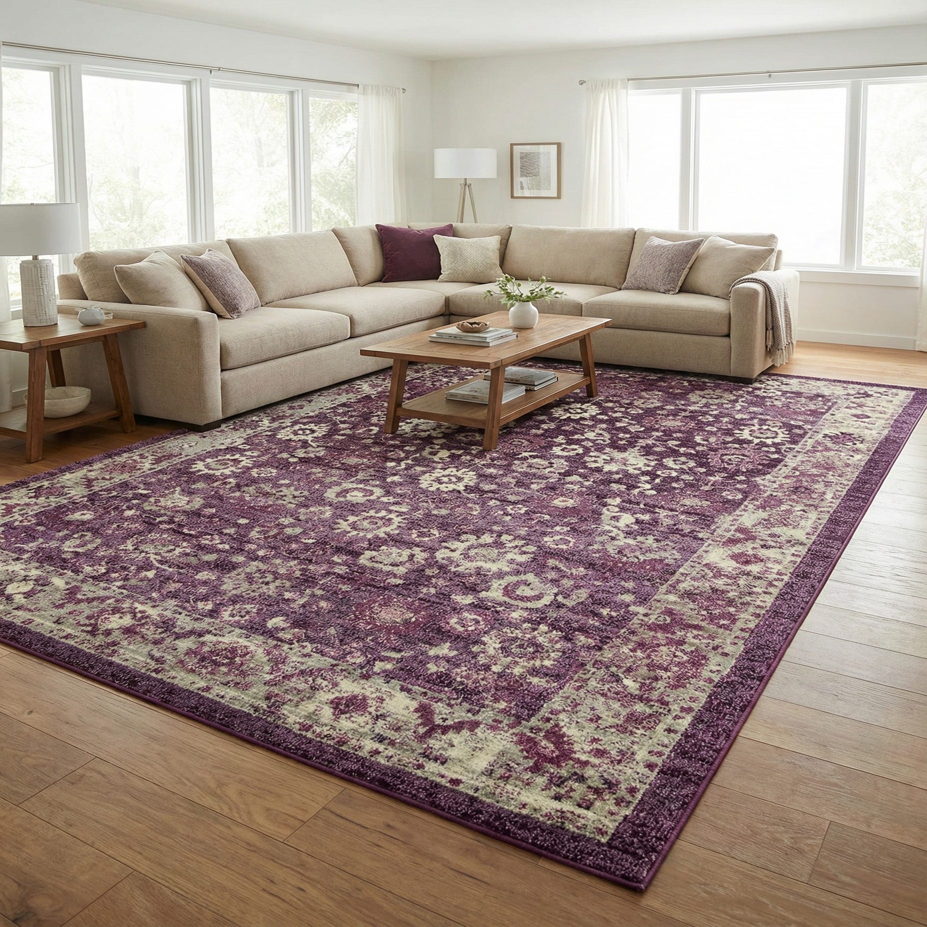 Primary color is Purple. Colors in this rug include: Purple, Ivory, Pink.