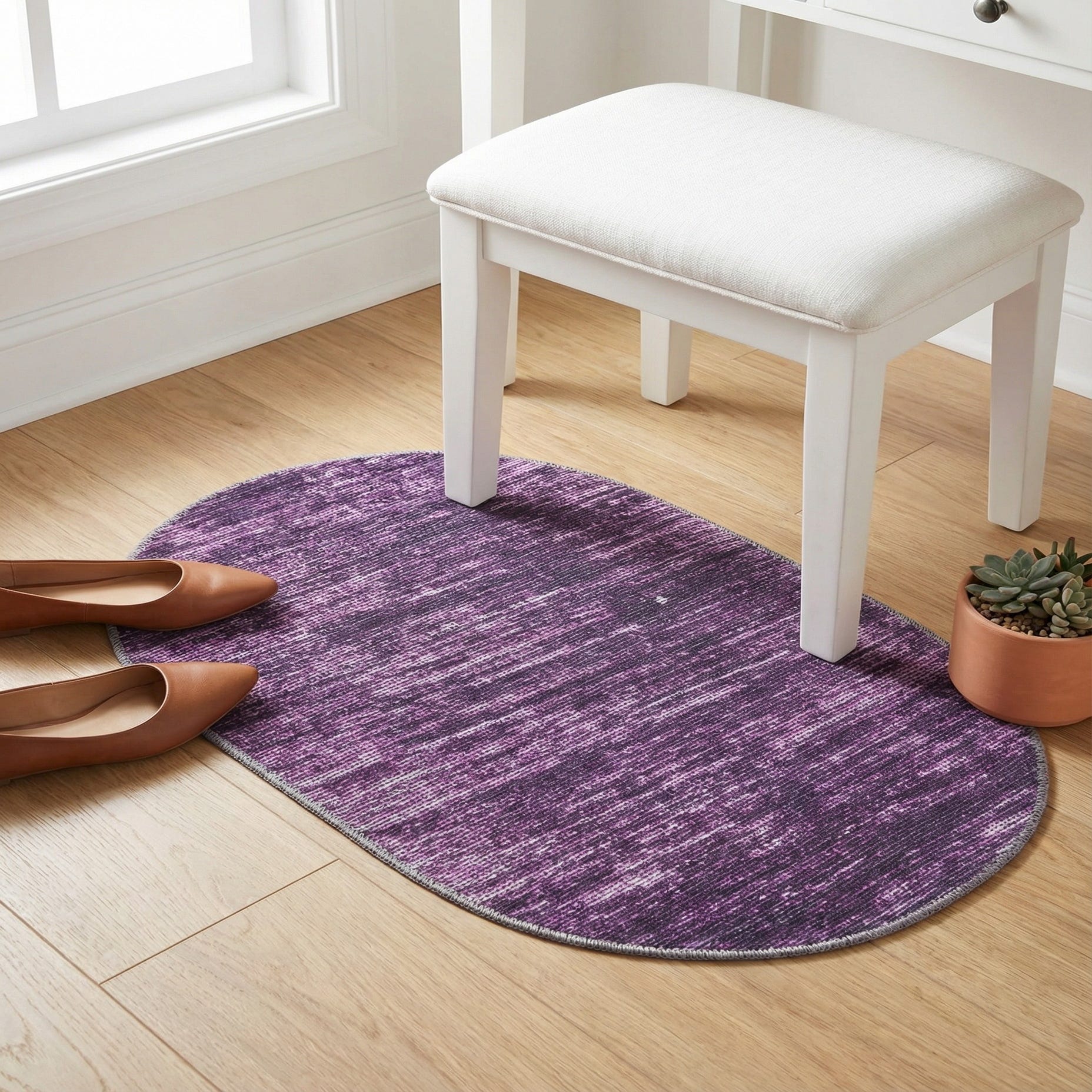 Primary color is Purple. Colors in this rug include: Purple, Ivory.