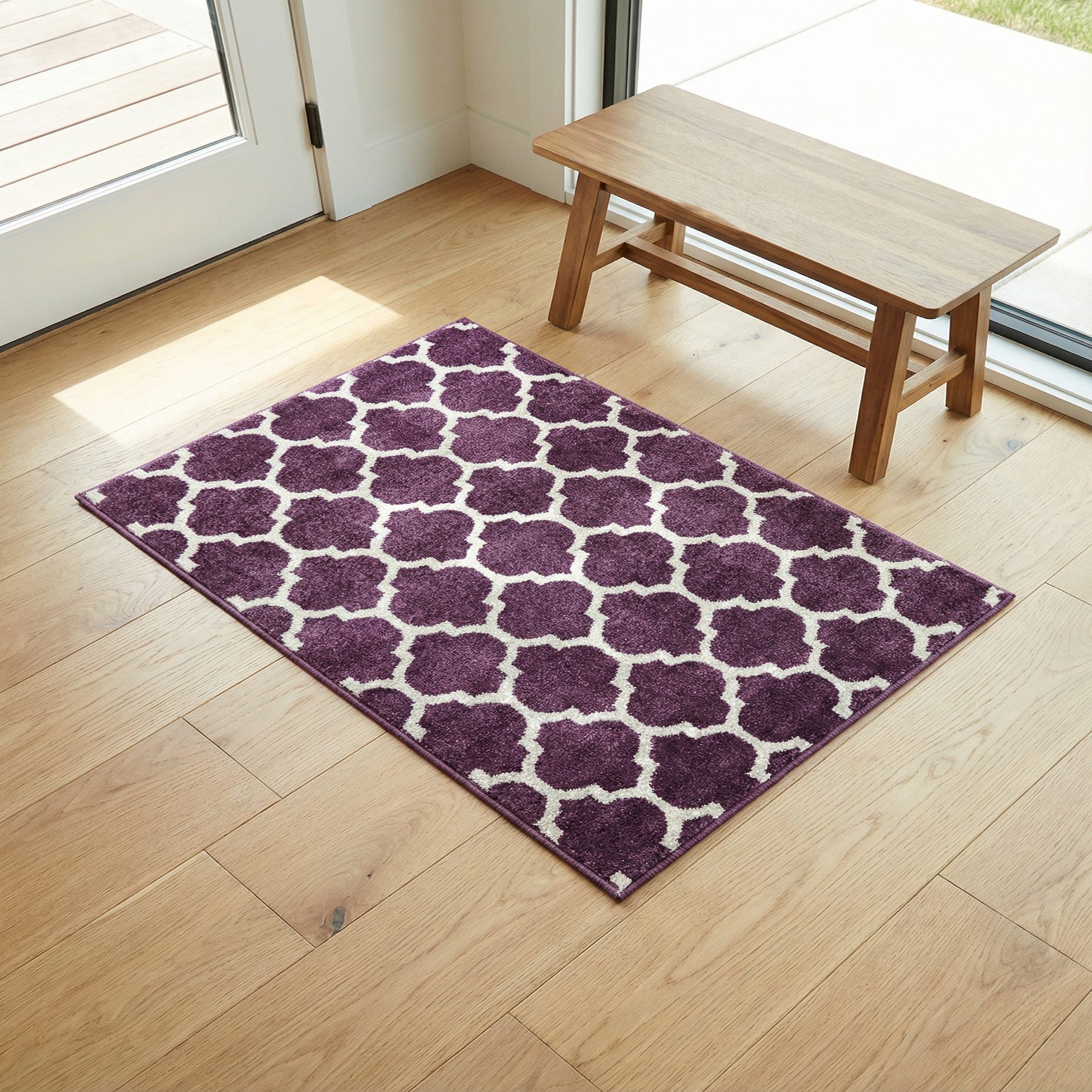 Primary color is Purple. Colors in this rug include: Purple, Ivory.