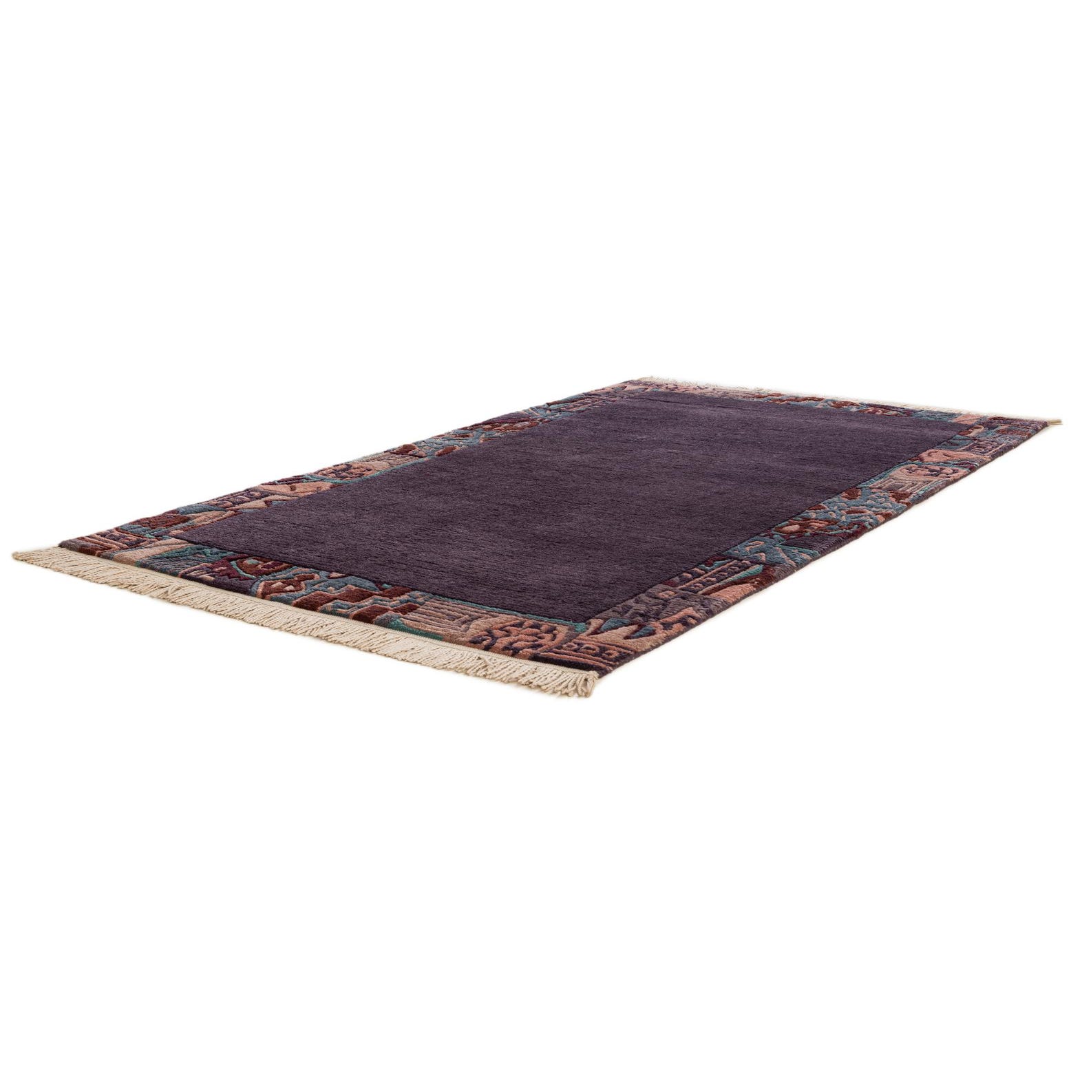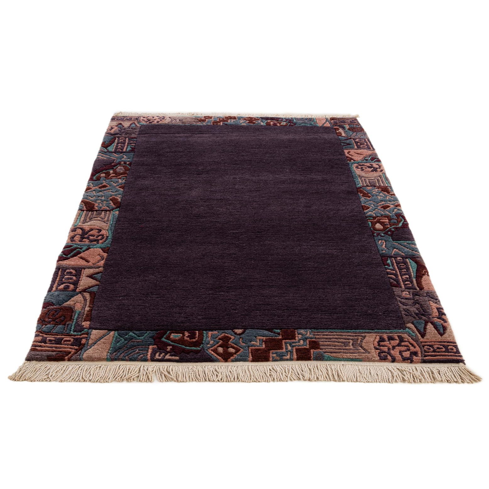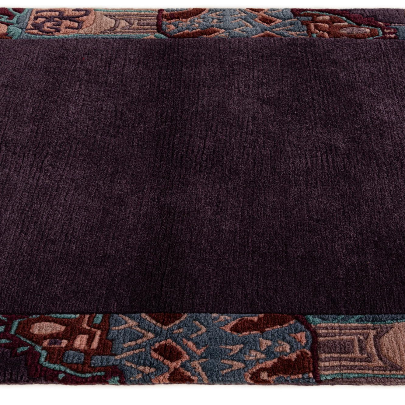 Primary color is Purple. Colors in this rug include: Purple, Blue, Burgundy, Green, Pink.