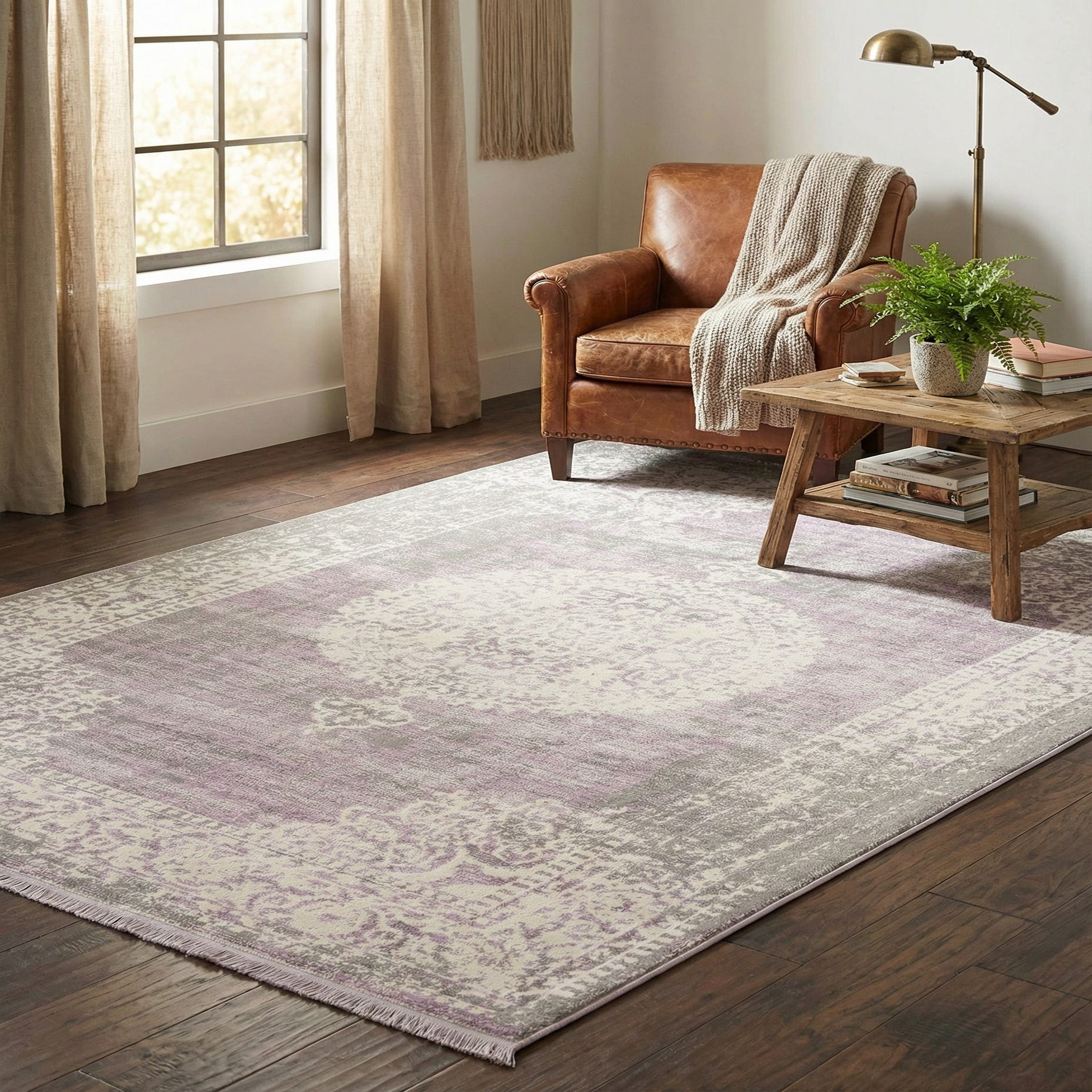 Primary color is Purple. Colors in this rug include: Purple, Gray, Ivory.
