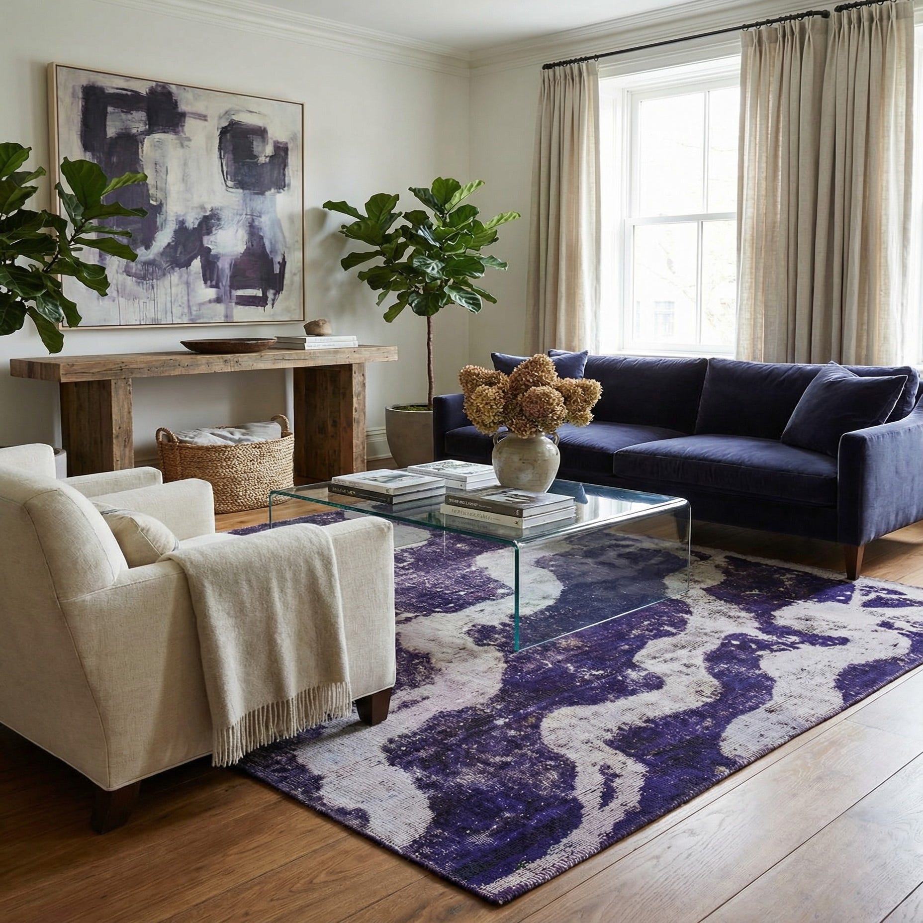 Primary color is Purple. Colors in this rug include: Purple, Gray, Violet.
