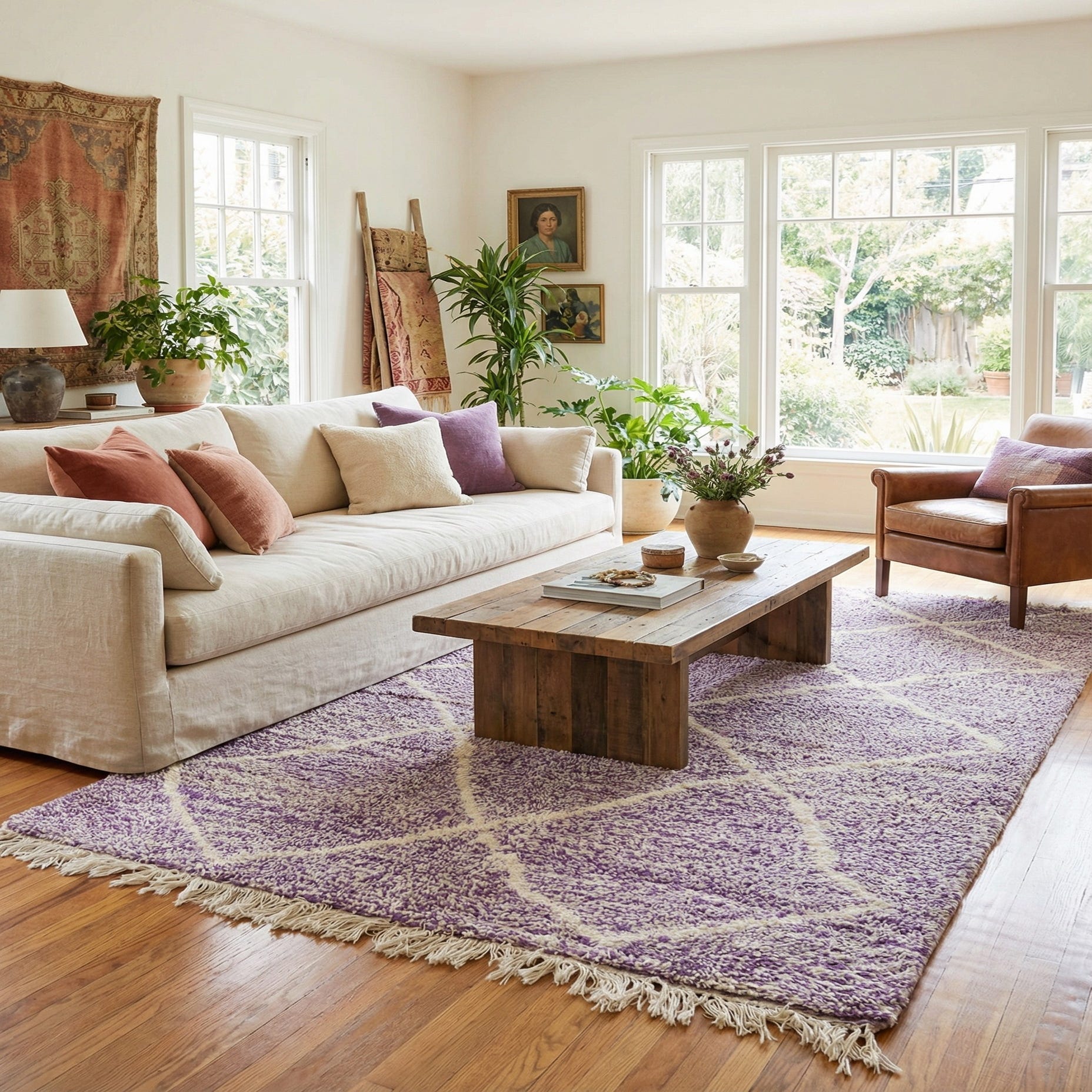 Primary color is Purple. Colors in this rug include: Purple, Ivory.