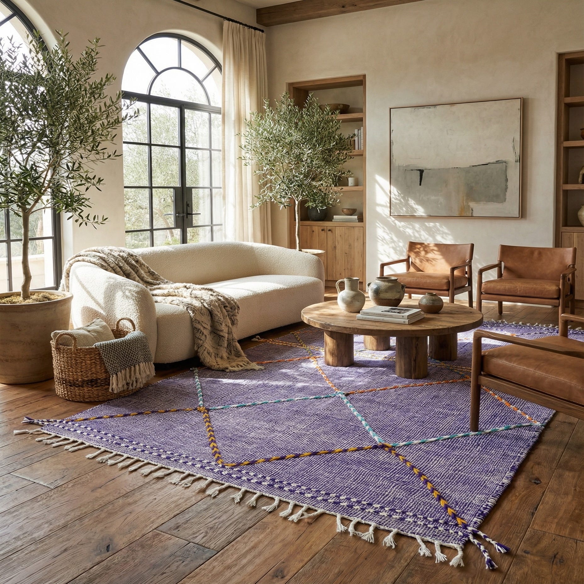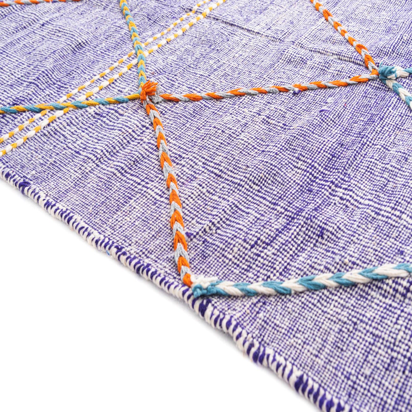 Primary color is Purple. Colors in this rug include: Purple, Gold, Gray, Ivory, Light Blue, Orange, Yellow.