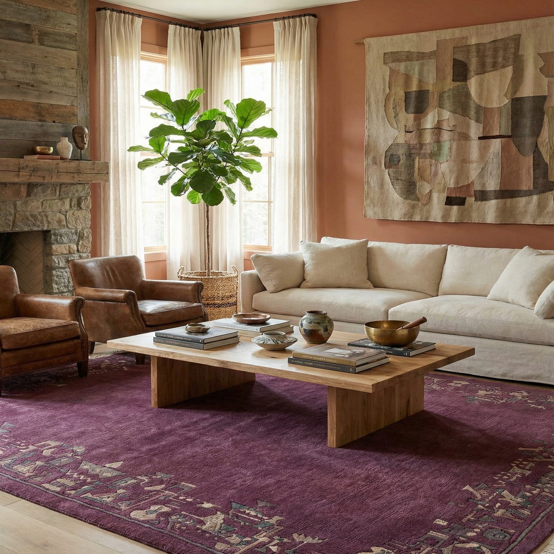 Primary color is Purple. Colors in this rug include: Purple, Gray, Ivory.