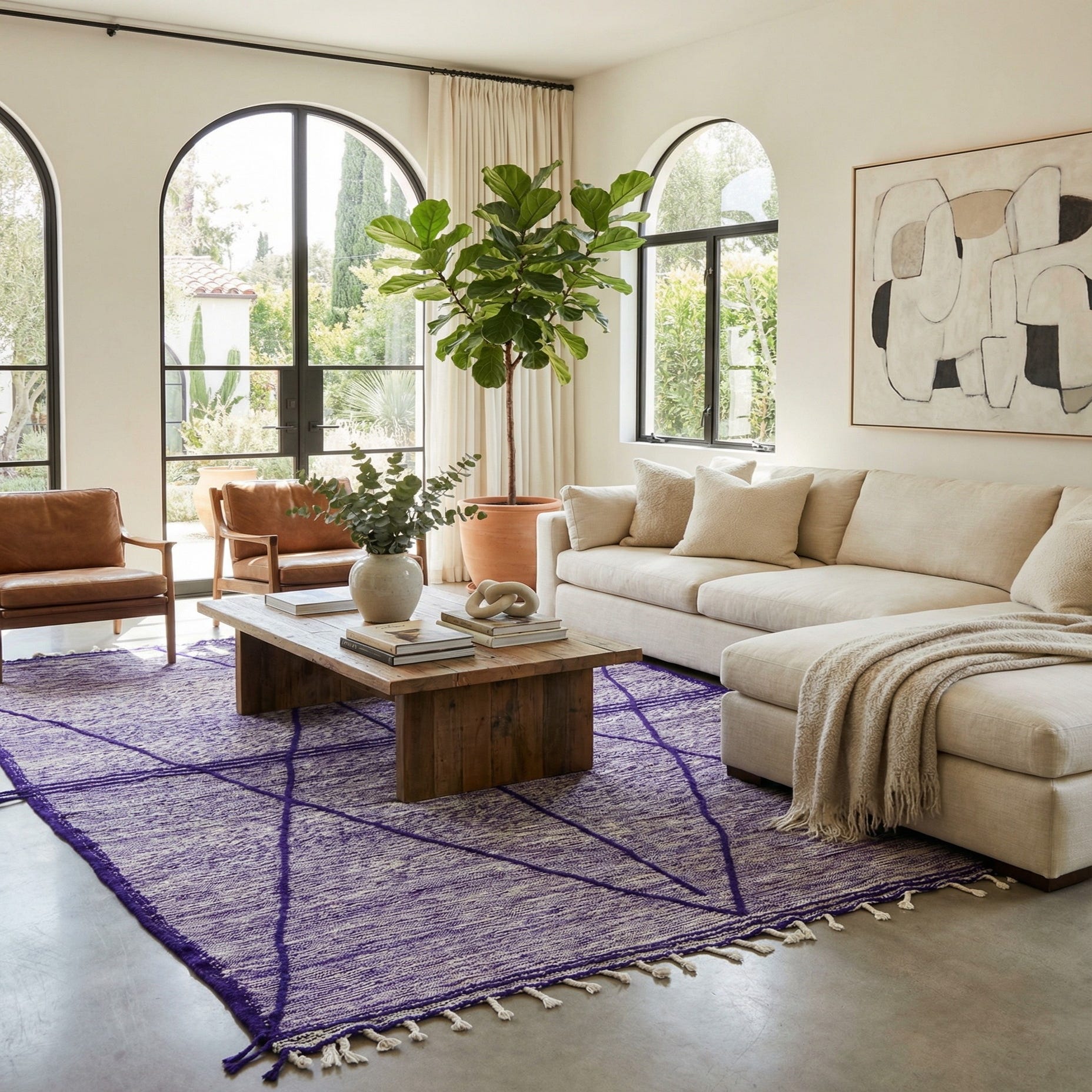 Primary color is Purple. Colors in this rug include: Purple, Ivory.
