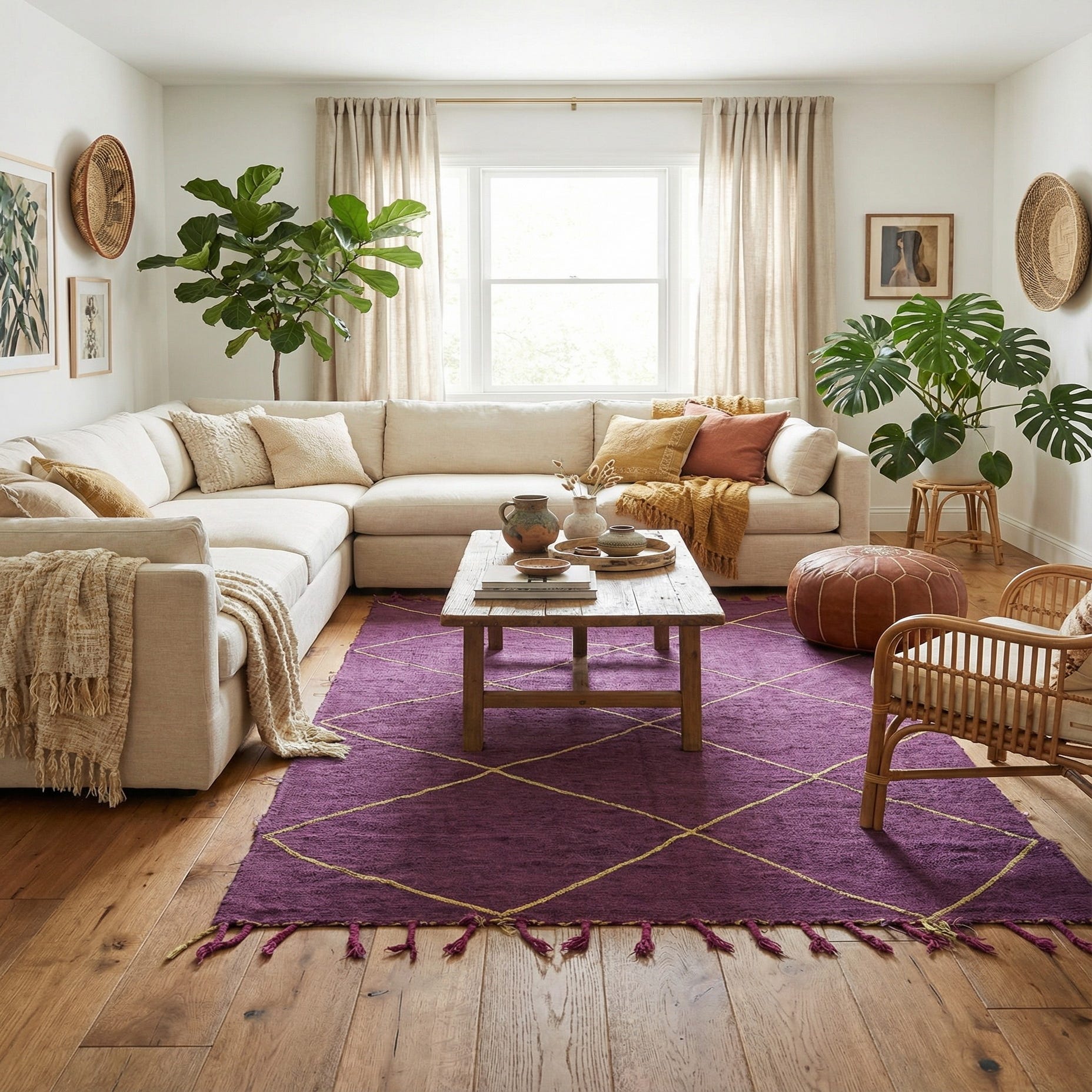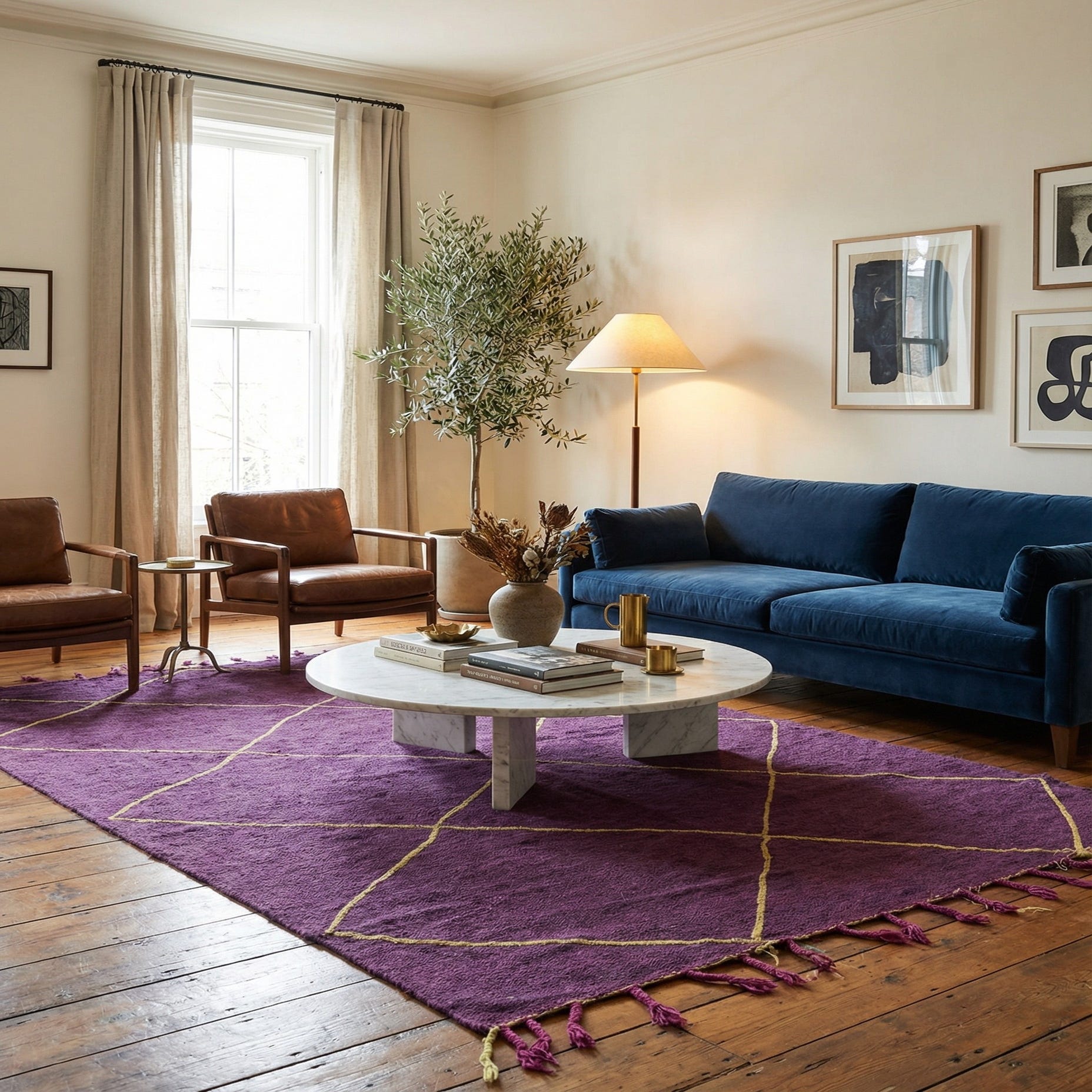 Primary color is Purple. Colors in this rug include: Purple, Light Green.