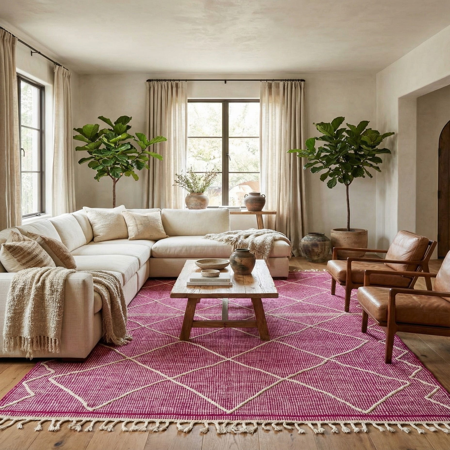 Primary color is Purple. Colors in this rug include: Purple, Ivory.