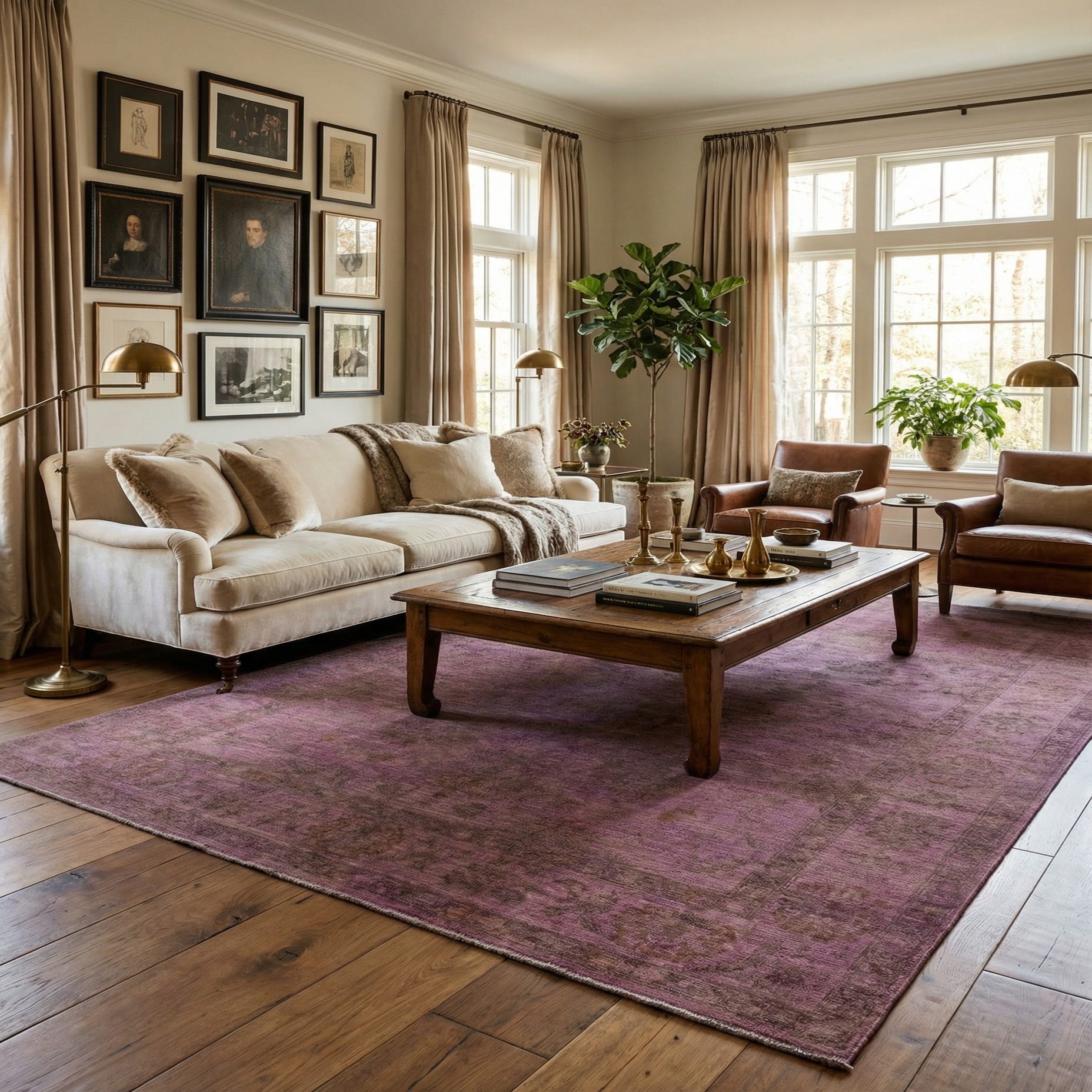 Primary color is Purple. Colors in this rug include: Purple, Gray, Brown.