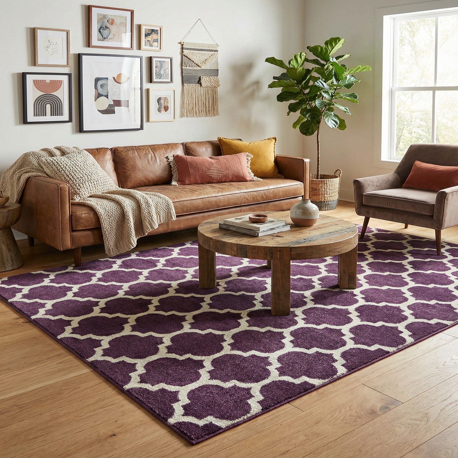 Primary color is Purple. Colors in this rug include: Purple, Ivory.
