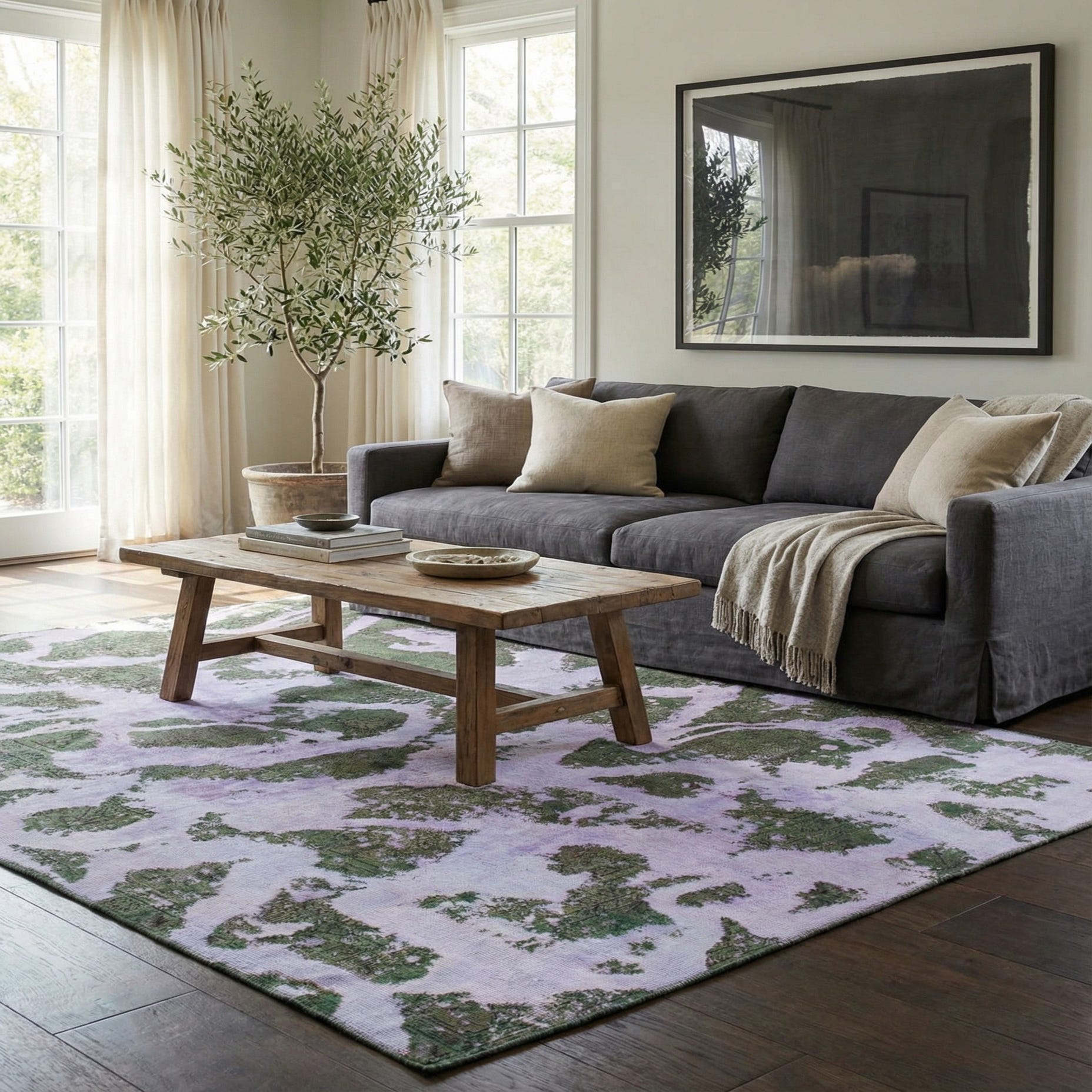 Primary color is Purple. Colors in this rug include: Purple, Gray, Green, Olive.