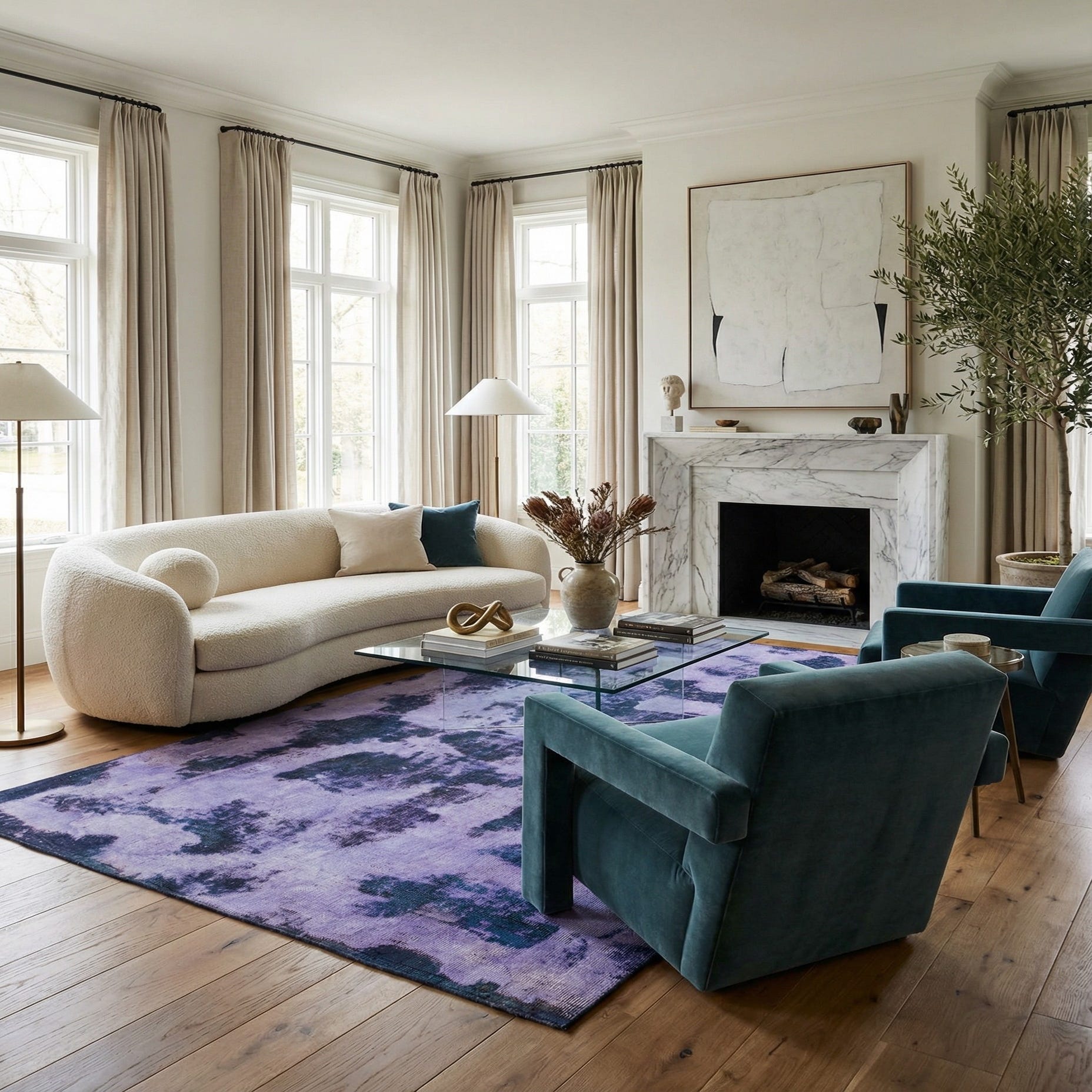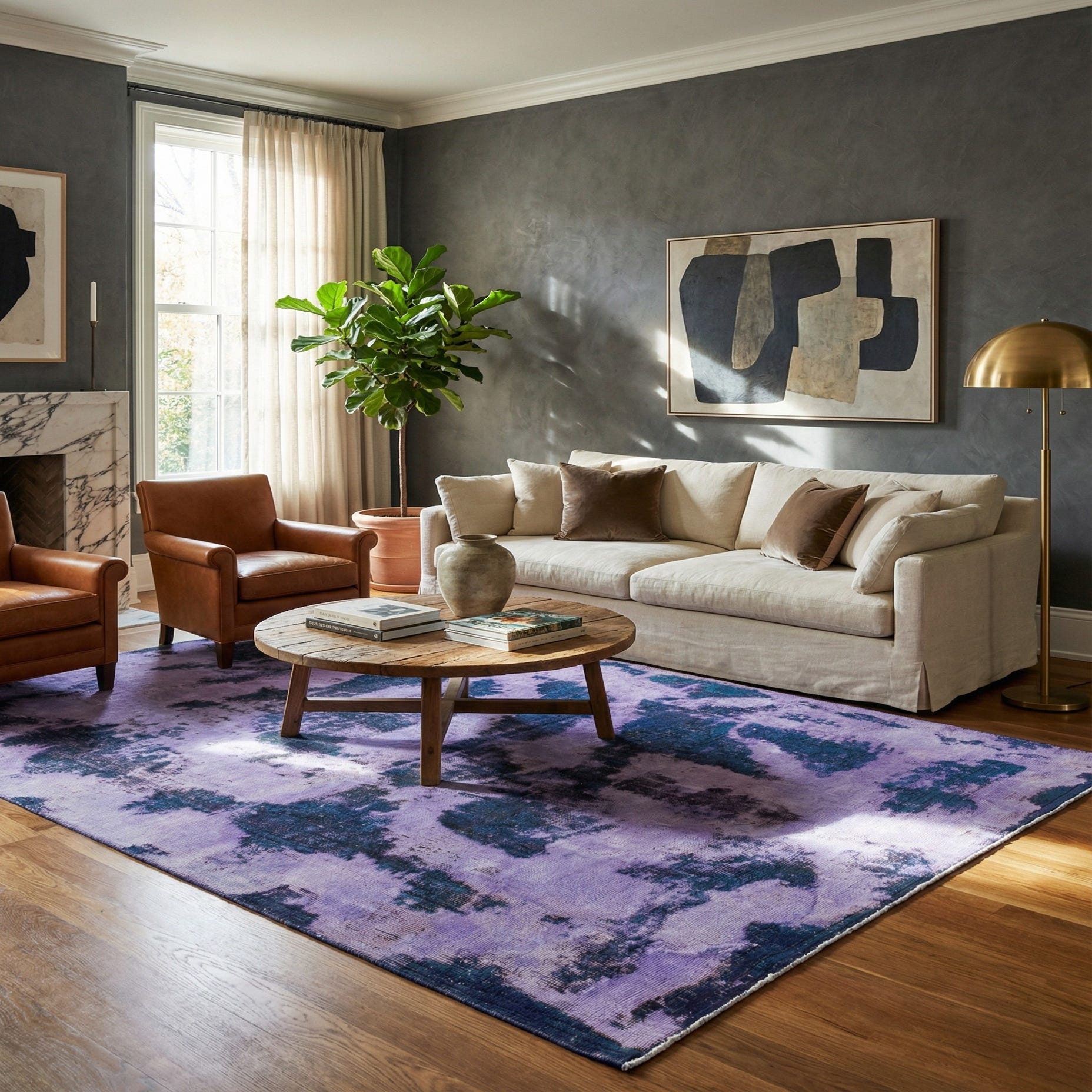Primary color is Purple. Colors in this rug include: Purple, Black, Green, Violet.