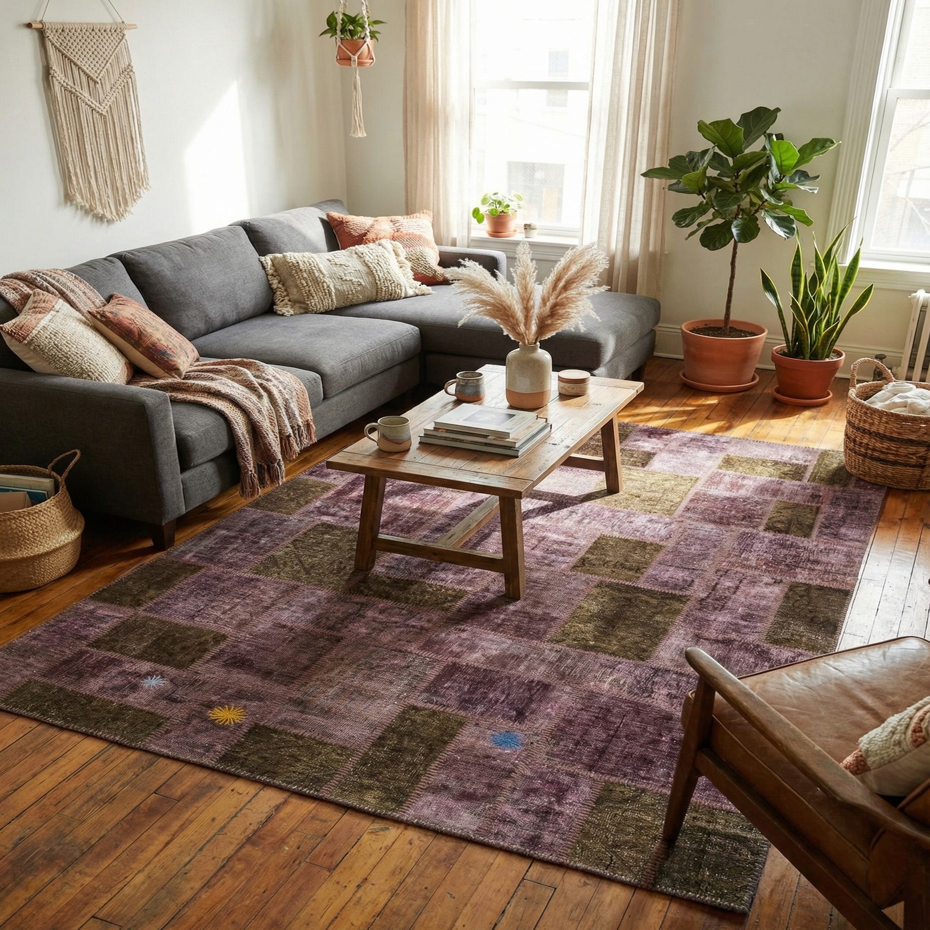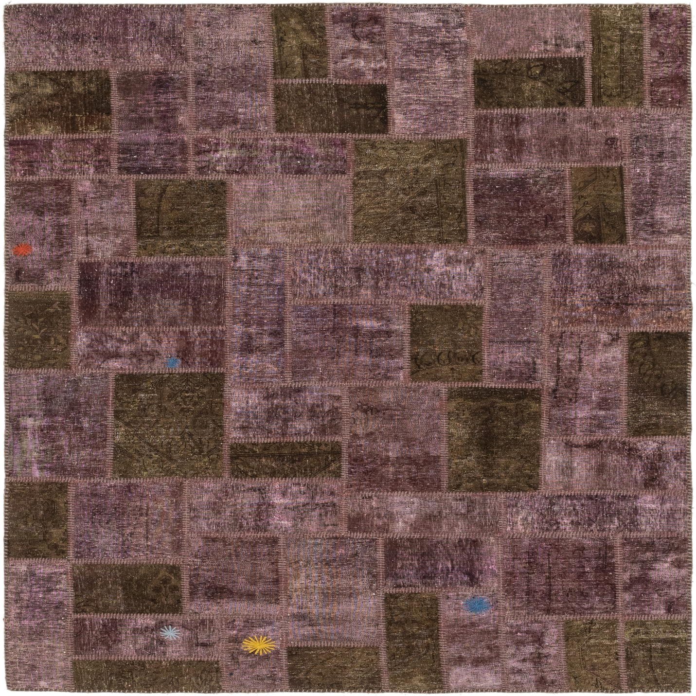 Primary color is Purple. Colors in this rug include: Purple, Black, Plum Red, Violet, Pink, Ivory, Blue, Yellow.
