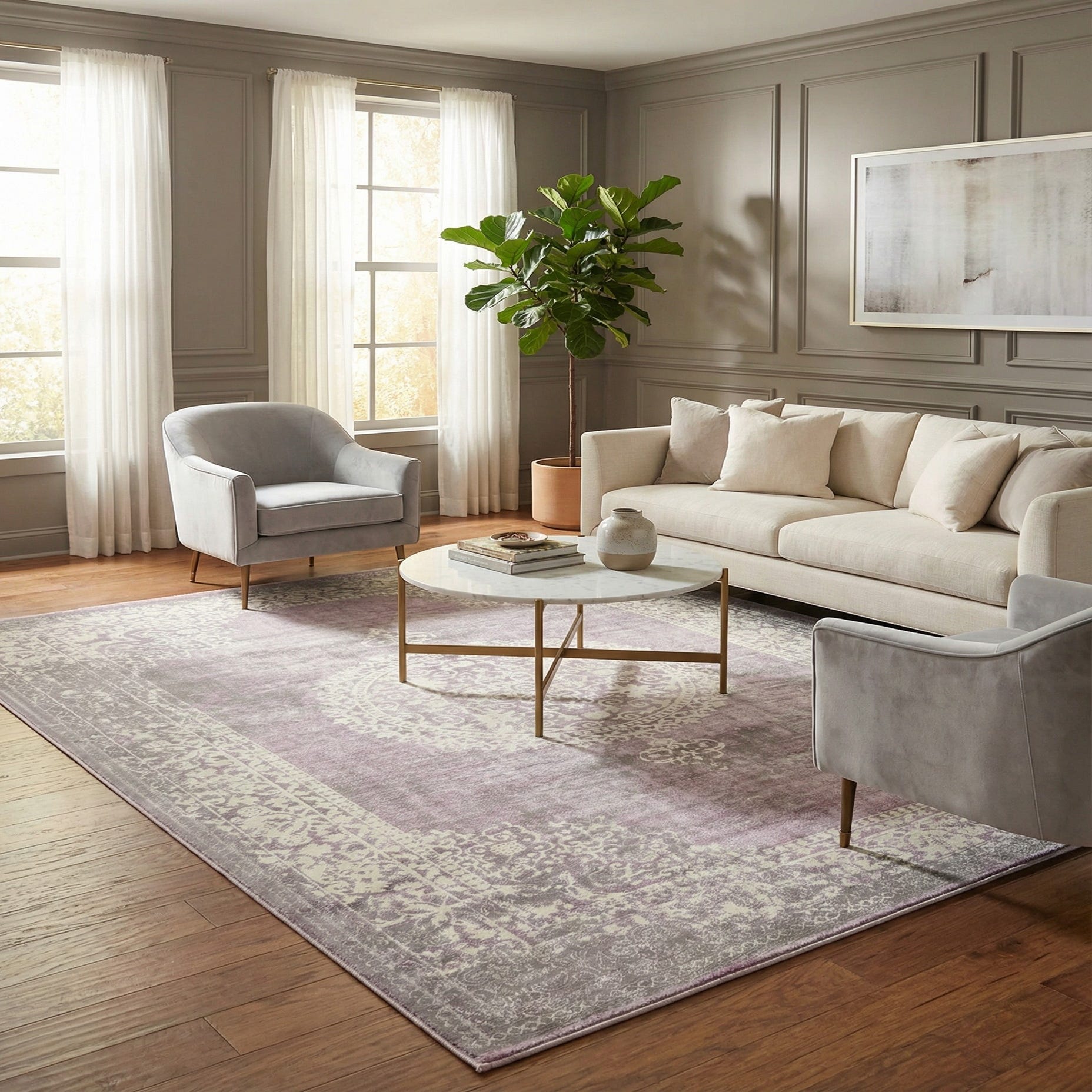 Primary color is Purple. Colors in this rug include: Purple, Gray, Ivory.