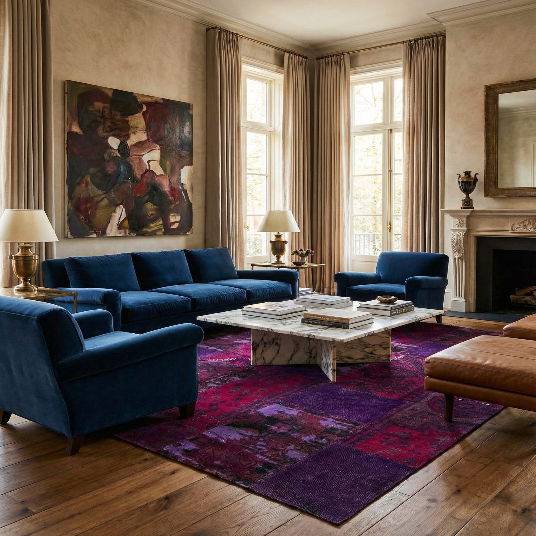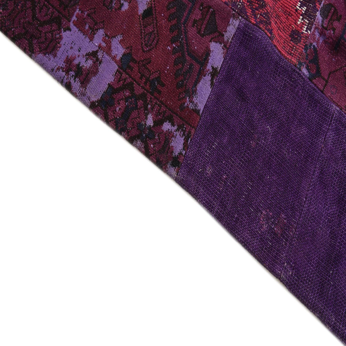 Primary color is Purple. Colors in this rug include: Purple, Black, Pink, Peach, Plum Red, Ivory.