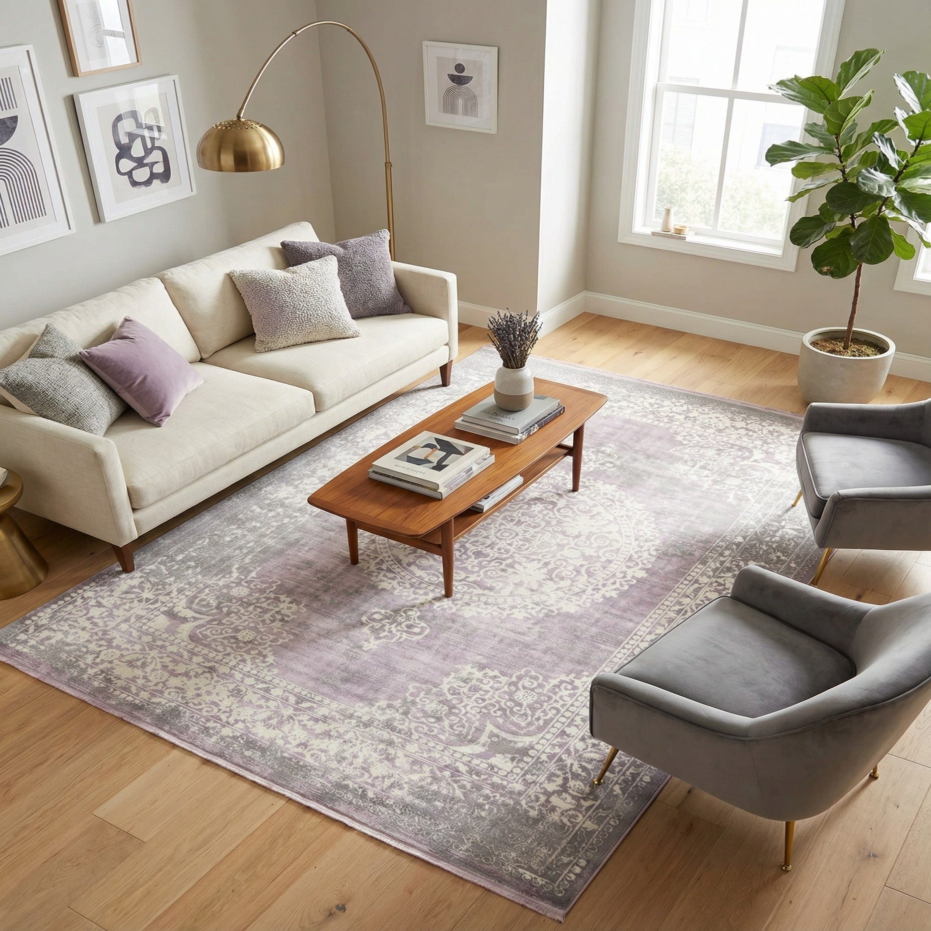 Primary color is Purple. Colors in this rug include: Purple, Gray, Ivory.