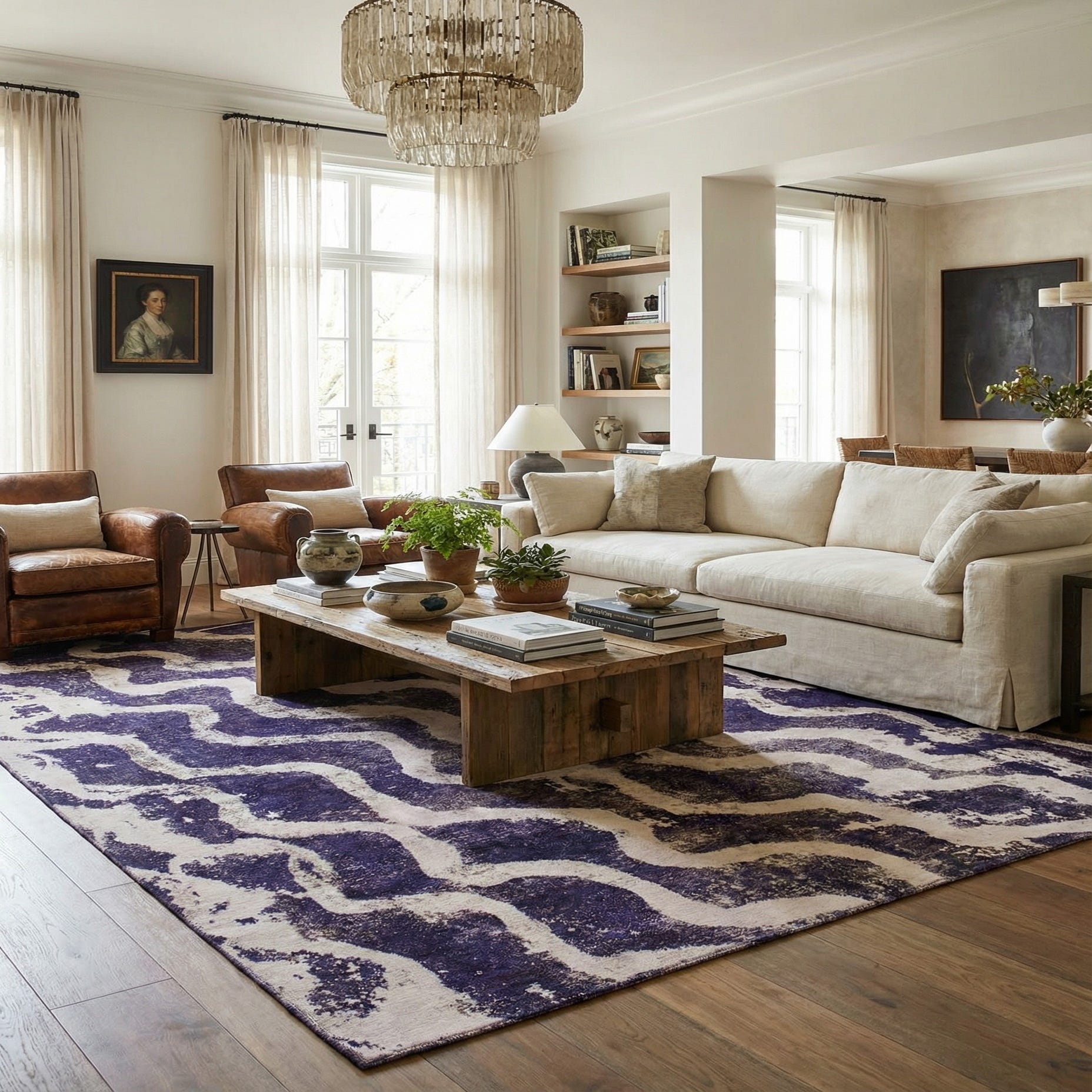 Primary color is Purple. Colors in this rug include: Purple, Beige.