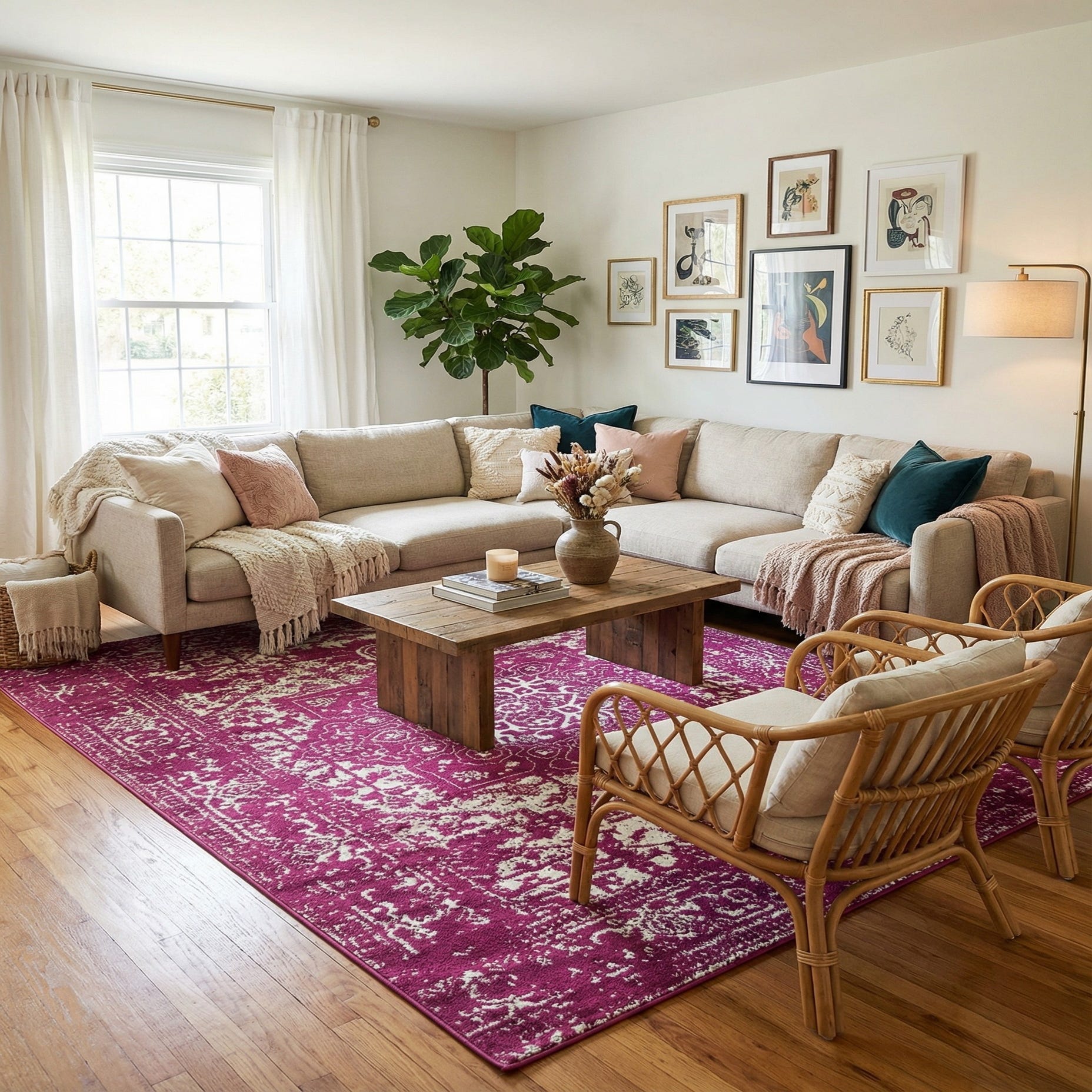 Primary color is Purple. Colors in this rug include: Purple, Ivory.