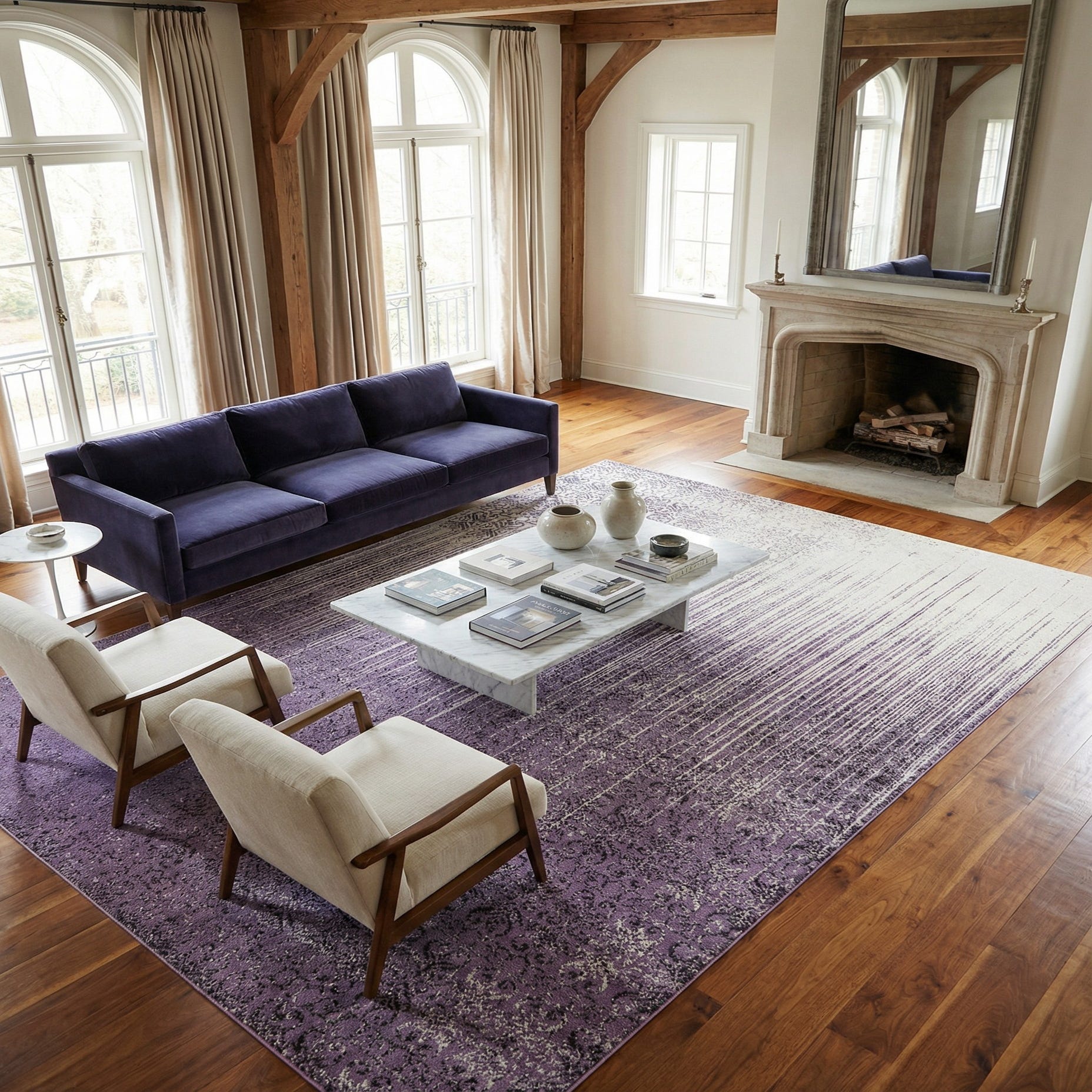 Primary color is Purple. Colors in this rug include: Purple, Ivory, Violet.