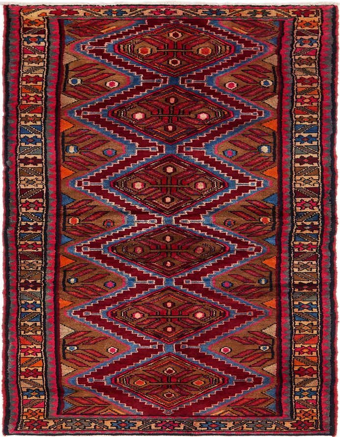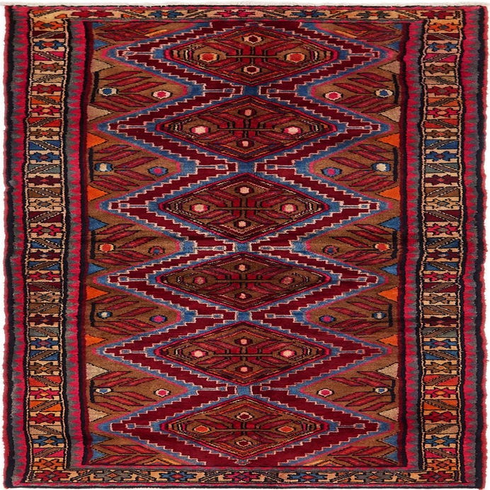 Primary color is Red. Colors in this rug include: Red, Black, Blue, Brown, Cream, Navy Blue, Orange, Tan, Gray.
