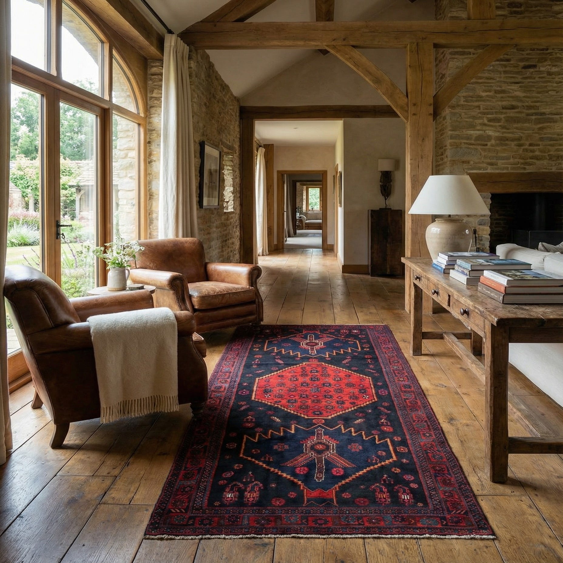 Primary color is Red. Colors in this rug include: Red, Dark Brown, Dark Blue.