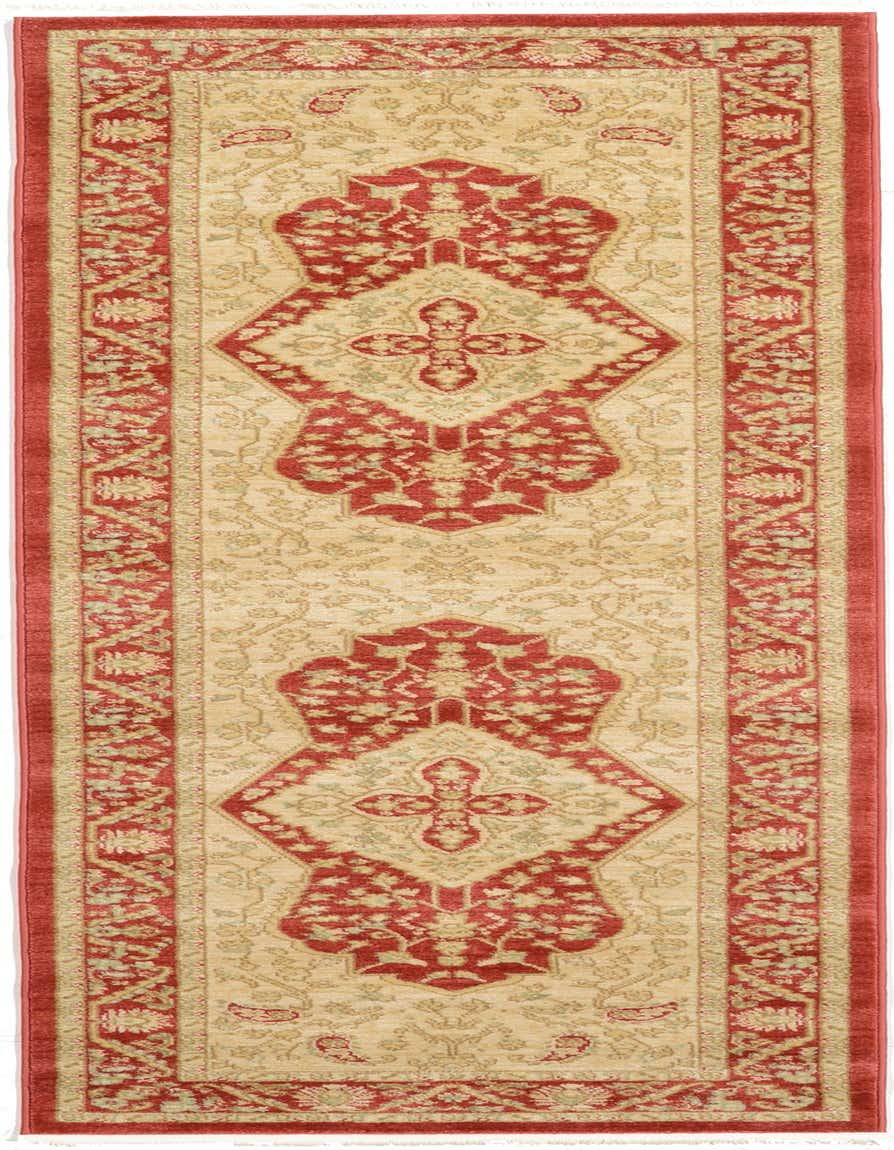 Primary color is Red. Colors in this rug include: Red, Beige, Cream, Light Brown, Light Green.
