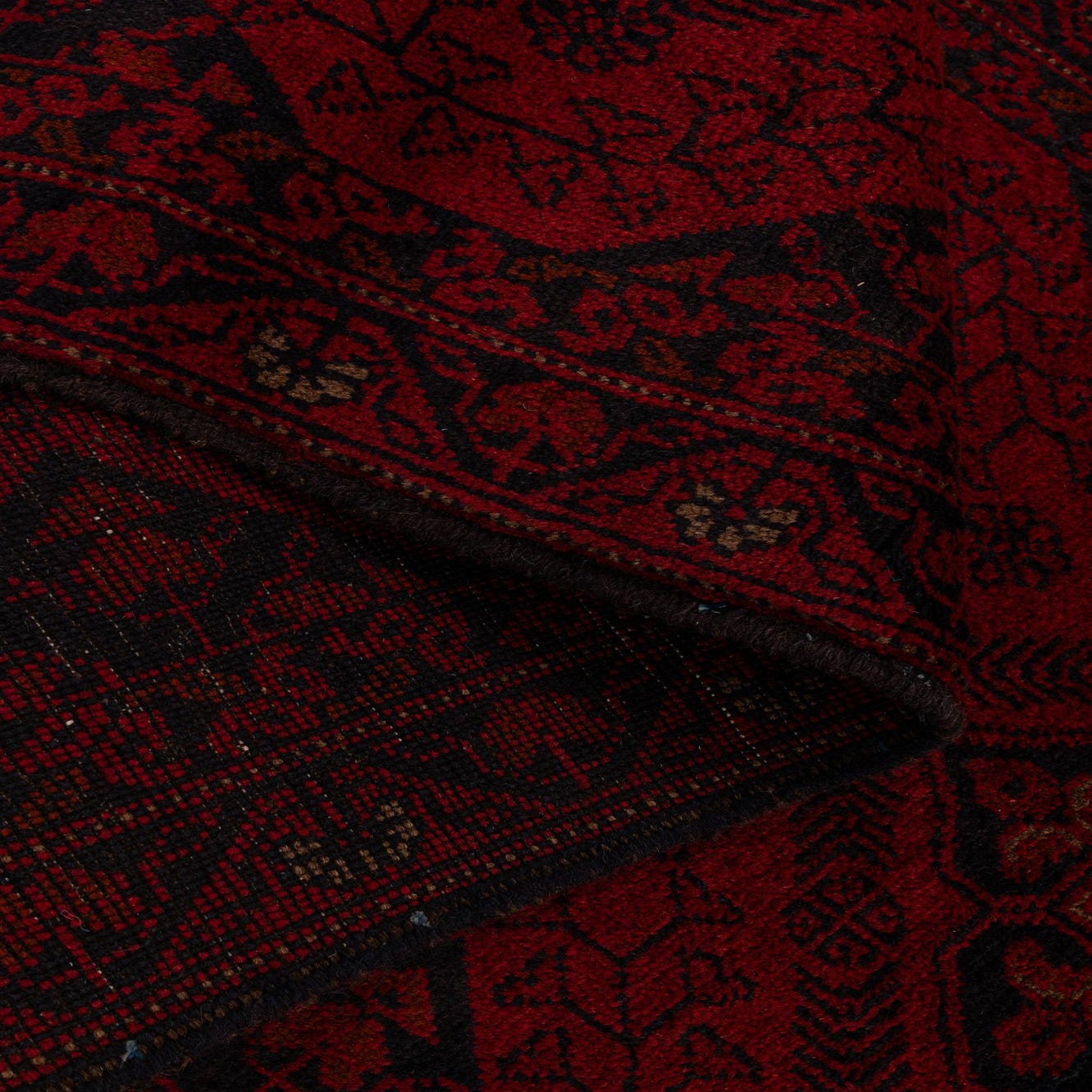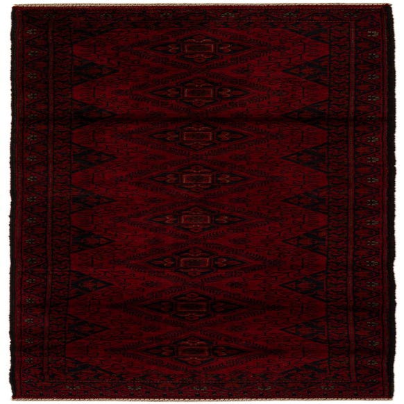 Primary color is Red. Colors in this rug include: Red, Black, Brown.