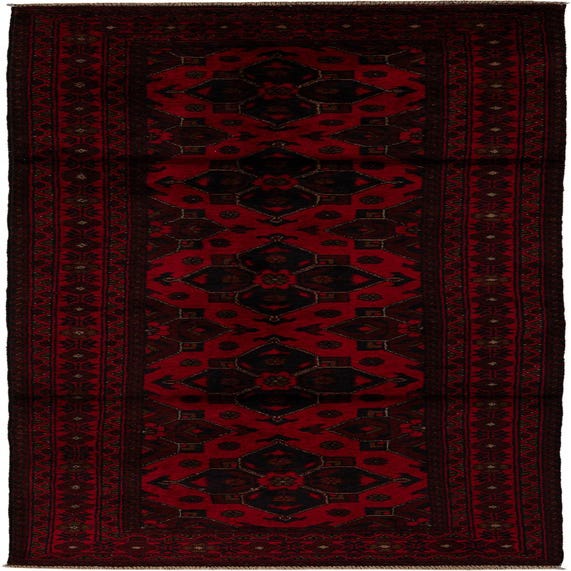 Primary color is Red. Colors in this rug include: Red, Brown, Navy Blue.