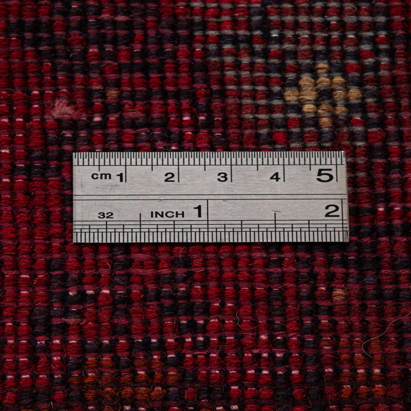 Primary color is Red. Colors in this rug include: Red, Brown, Navy Blue.