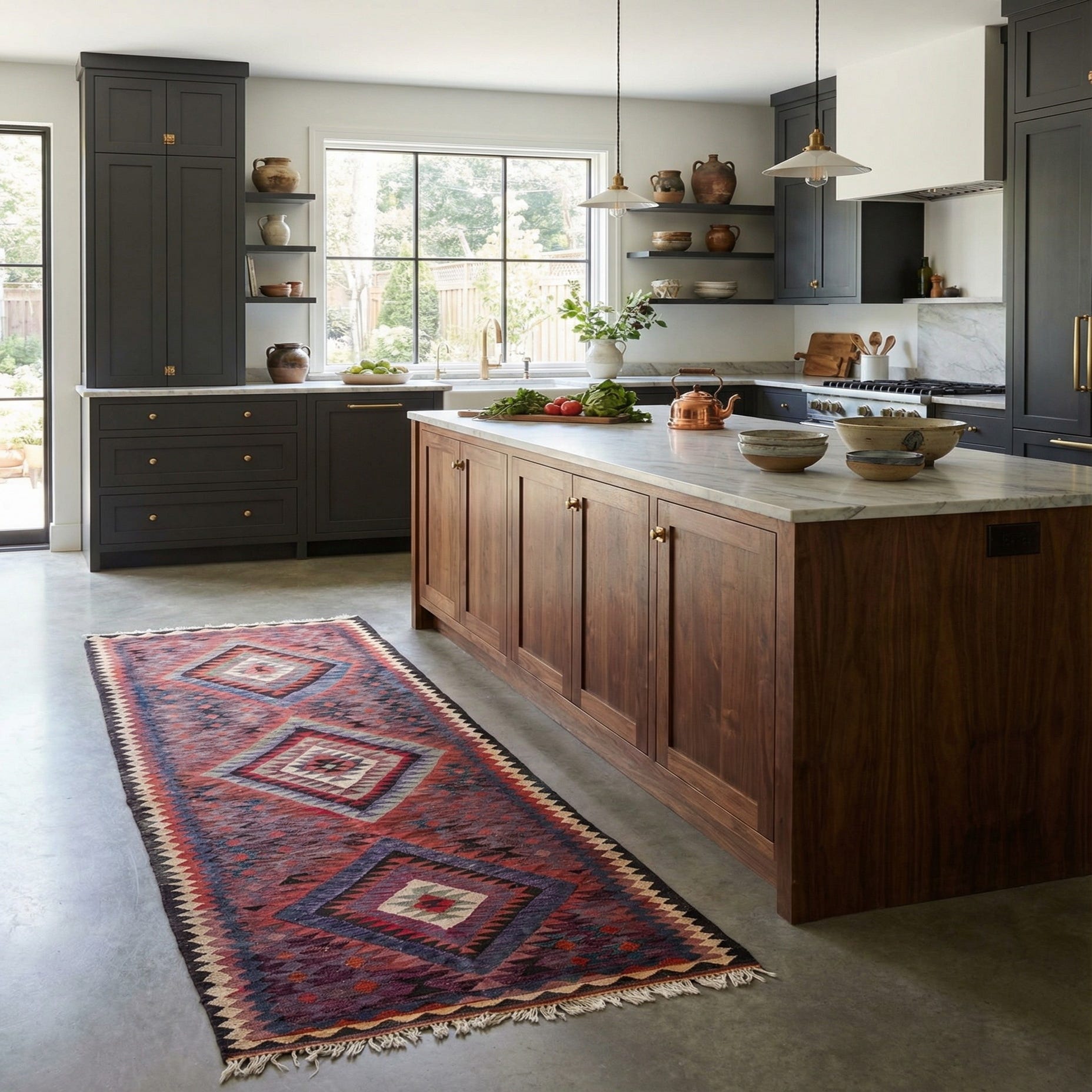 Primary color is Red. Colors in this rug include: Red, Black, Cream, Light Green, Navy Blue.