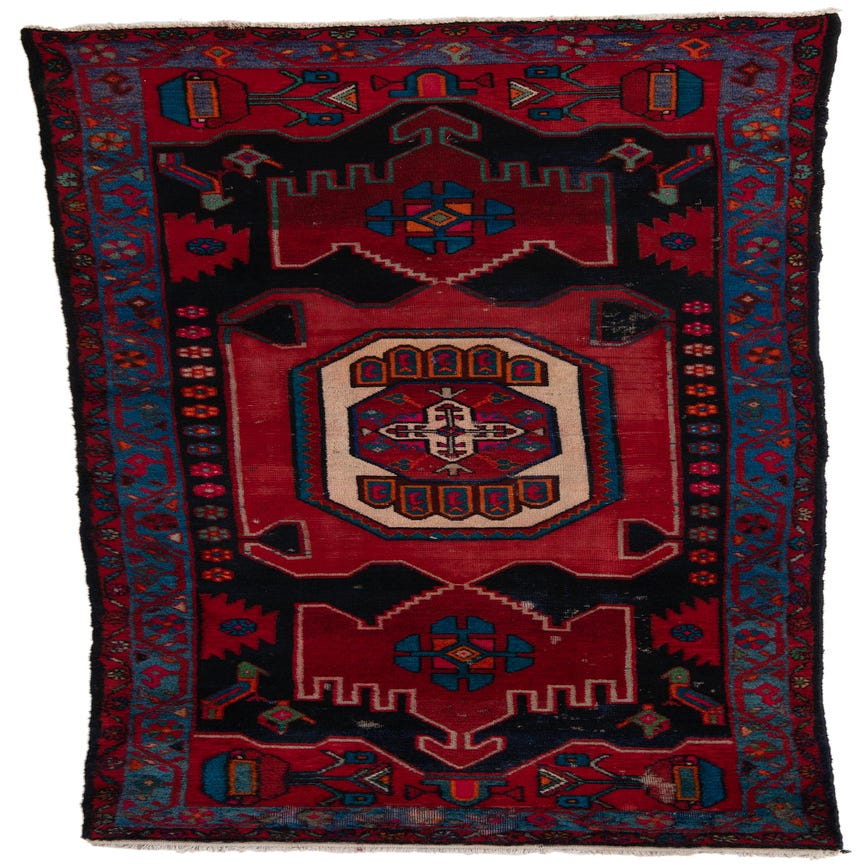 Primary color is Red. Colors in this rug include: Red, Blue, Green, Ivory, Navy Blue, Orange, Pink.