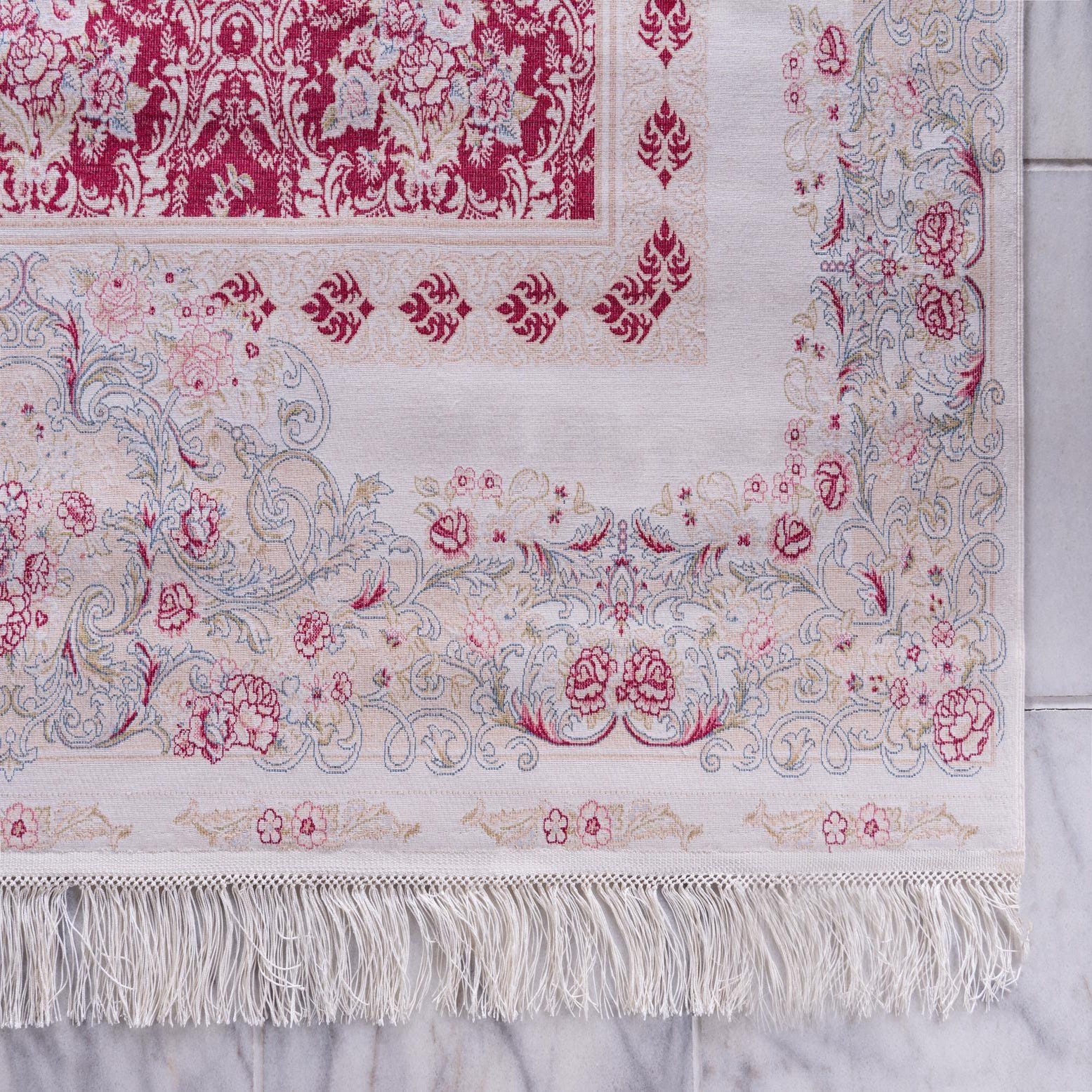 Primary color is Red. Colors in this rug include: Red, Beige, Green, Ivory, Light Blue, Light Green, Pink.