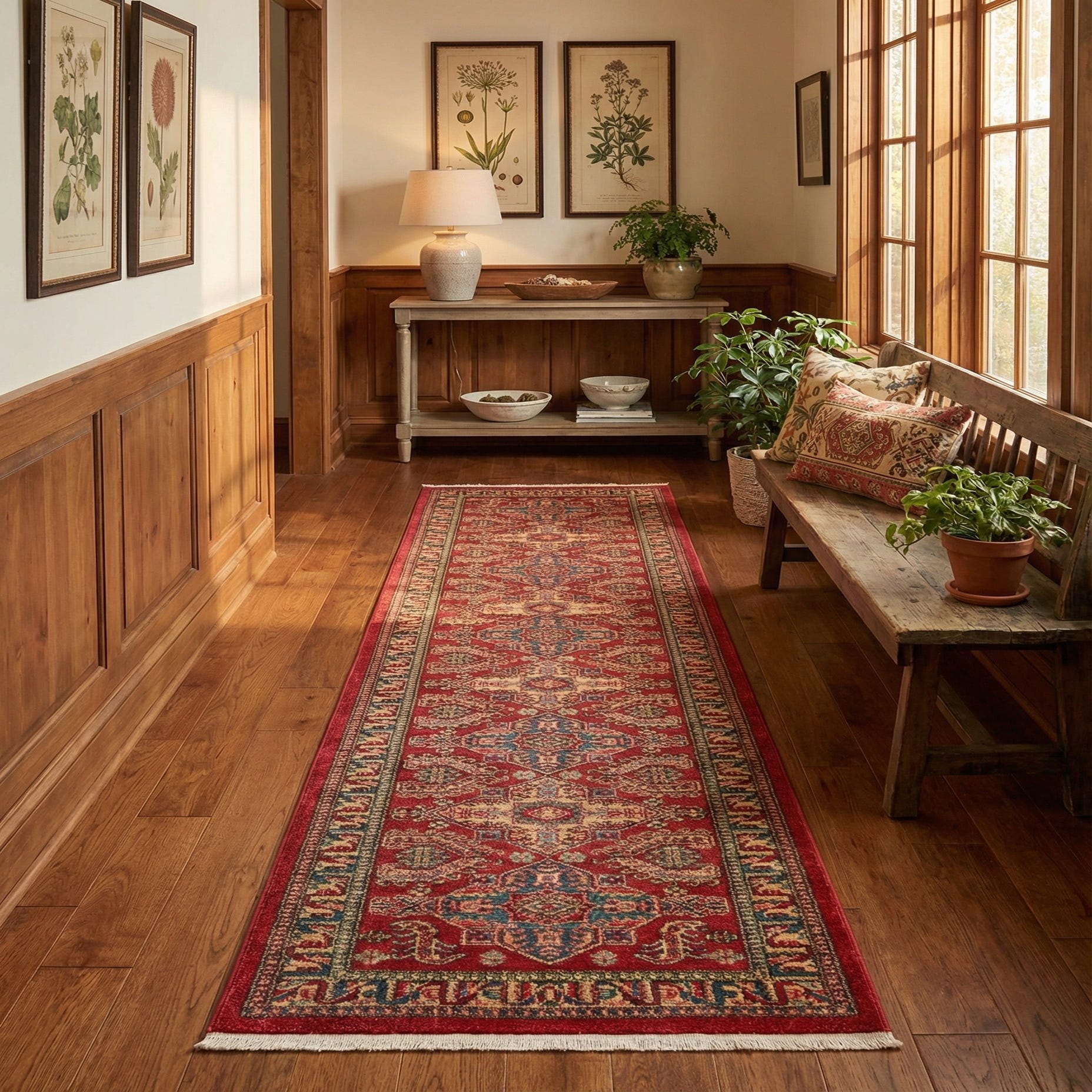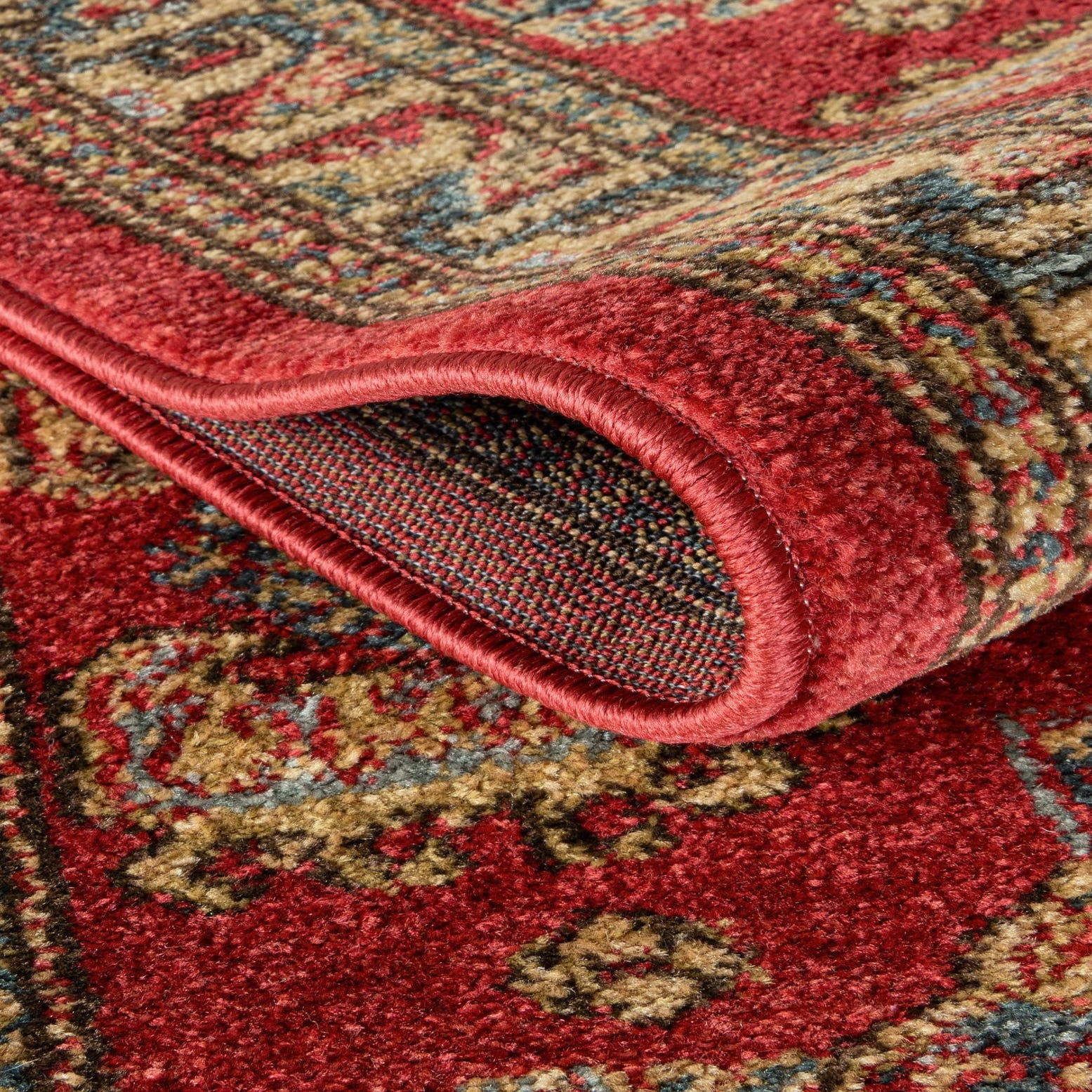 Primary color is Red. Colors in this rug include: Red, Beige, Light Blue, Navy Blue, Light Green, Brown.